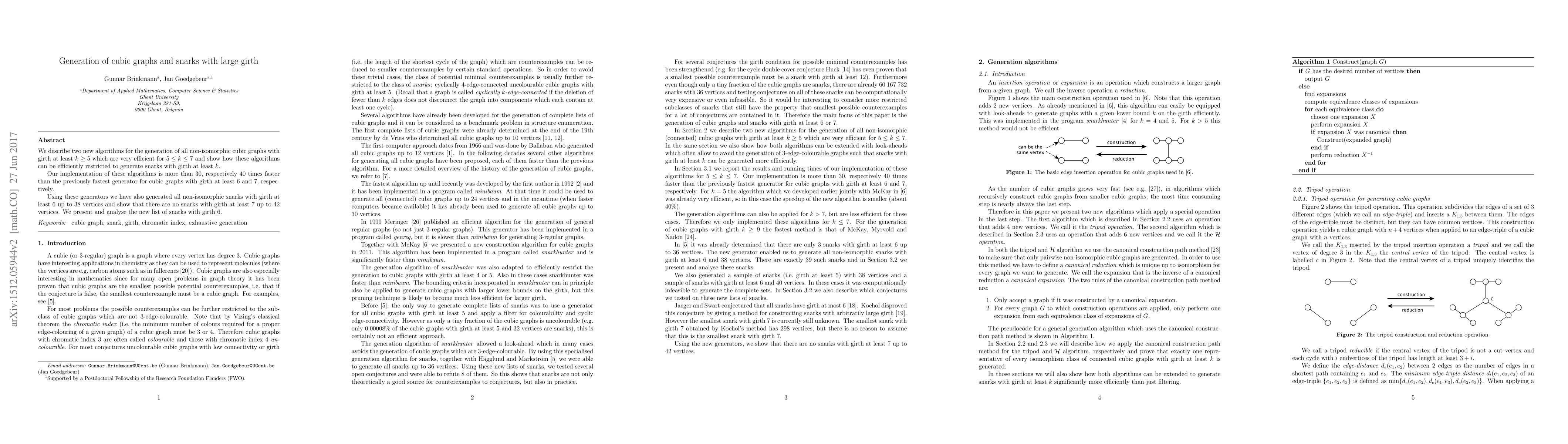 The paper introduces efficient algorithms for generating cubic graphs and snarks with large girth, along with a look-ahead method for 3-edge-colorability in tripod insertion operations.