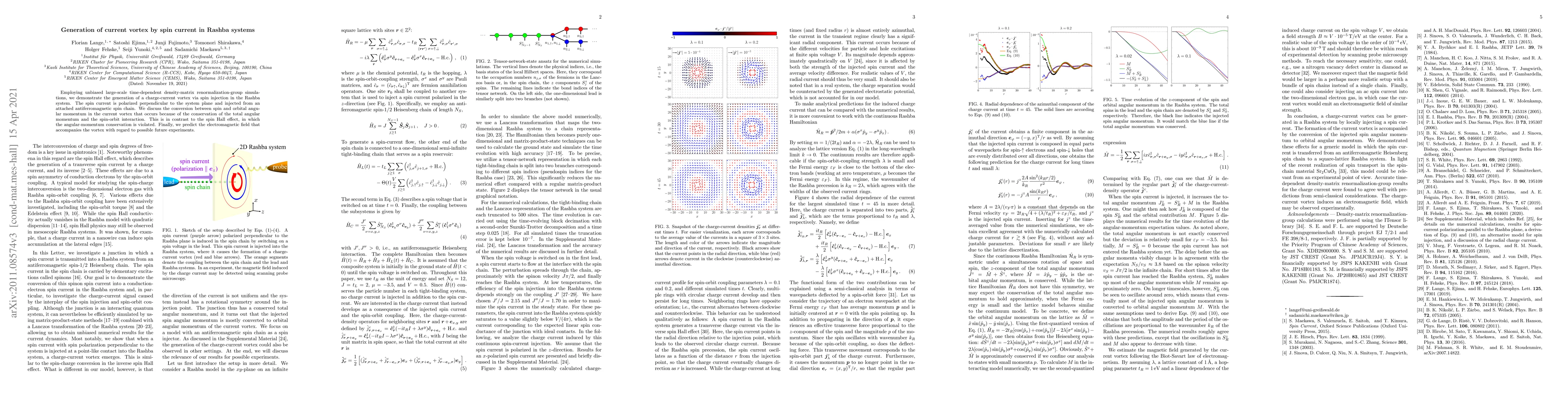 Employing unbiased large-scale time-dependent density-matrix renormalization-group simulations, we demonstrate the generation of a charge-current vortex via spin injection in the Rashba system. The spin current is polarized perpendicular to the system plane and injected from an attached antiferromagnetic spin chain. We discuss the conversion between spin and orbital angular momentum in the current vortex that occurs because of the conservation of the total angular momentum and the spin-orbit interaction. This is in contrast to the spin Hall effect, in which the angular-momentum conservation is violated. Finally, we predict the electromagnetic field that accompanies the vortex with regard to possible future experiments.