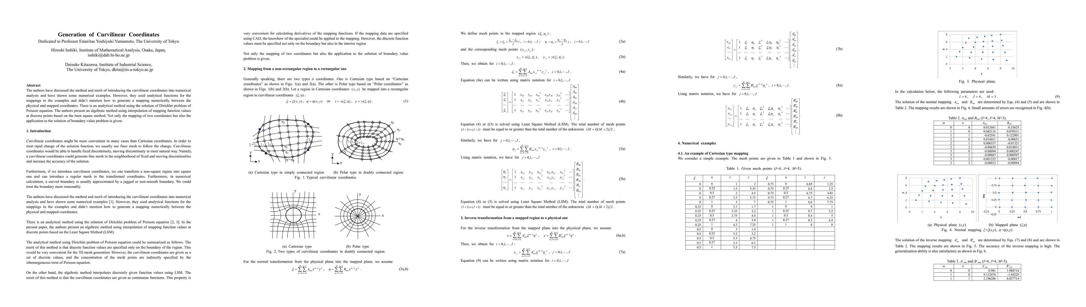 The authors have discussed the method and merit of introducing the curvilinear coordinates into numerical analysis and have shown some numerical examples. However, they used analytical functions for the mappings in the examples and didn't mention how to generate a mapping numerically between the physical and mapped coordinates. There is an analytical method using the solution of Dirichlet problem of Poisson equation. The authors present an algebraic method using interpolation of mapping function values at discrete points based on the least square method. Not only the mapping of two coordinates but also the application to the solution of boundary value problem is given.