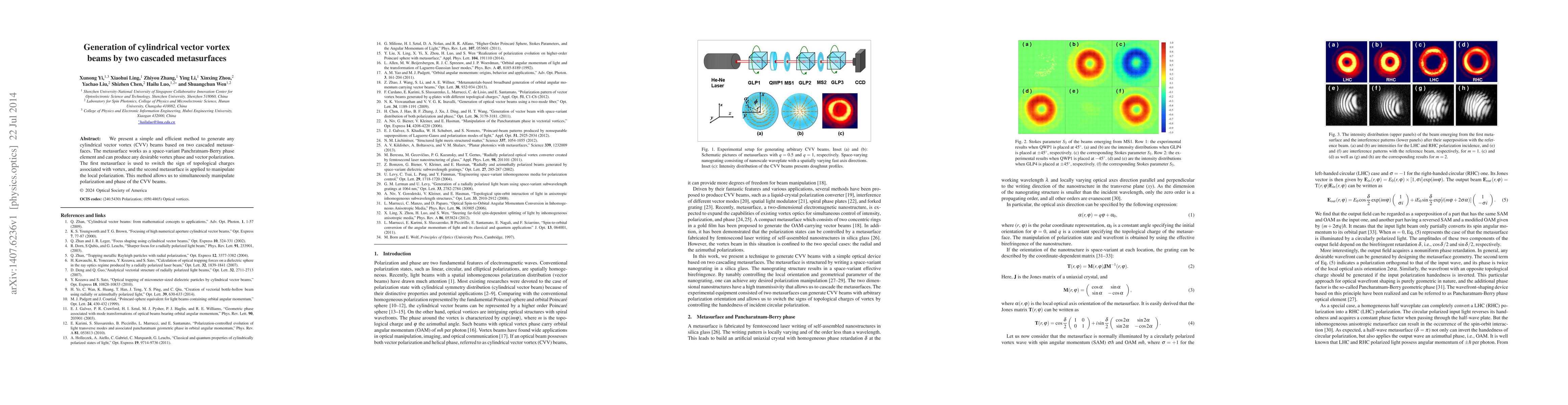 This paper proposes a method to generate cylindrical vector vortex beams using two cascaded metasurfaces, enabling control over both the vortex phase and vector polarization through space-variant Pancharatnam-Berry phase manipulation.