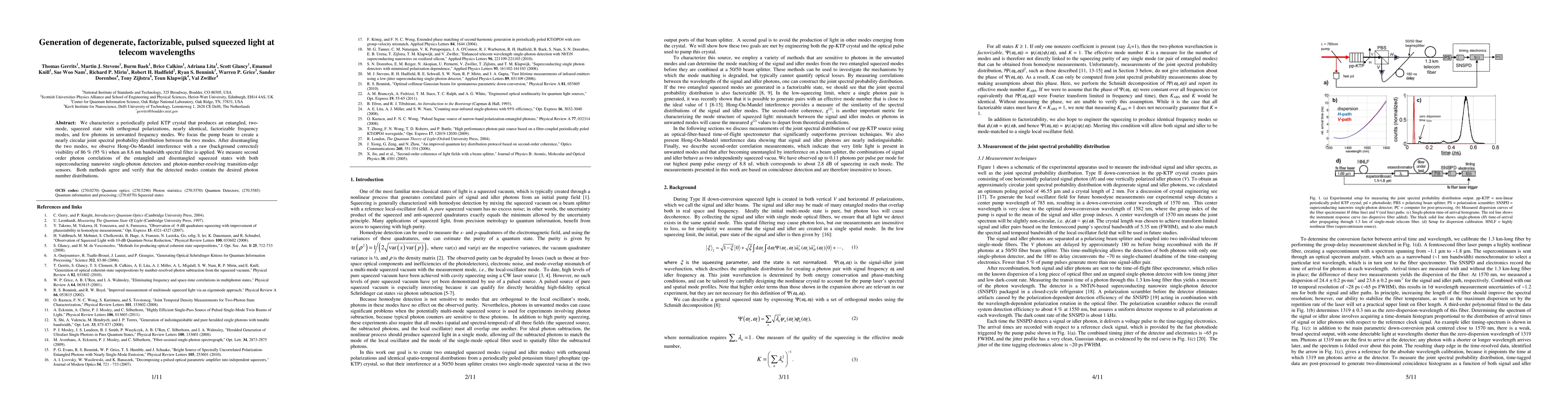 We characterize a periodically poled KTP crystal that produces an entangled, two-mode, squeezed state with orthogonal polarizations, nearly identical, factorizable frequency modes, and few photons in unwanted frequency modes. We focus the pump beam to create a nearly circular joint spectral probability distribution between the two modes. After disentangling the two modes, we observe Hong-Ou-Mandel interference with a raw (background corrected) visibility of 86 % (95 %) when an 8.6 nm bandwidth spectral filter is applied. We measure second order photon correlations of the entangled and disentangled squeezed states with both superconducting nanowire single-photon detectors and photon-number-resolving transition-edge sensors. Both methods agree and verify that the detected modes contain the desired photon number distributions.