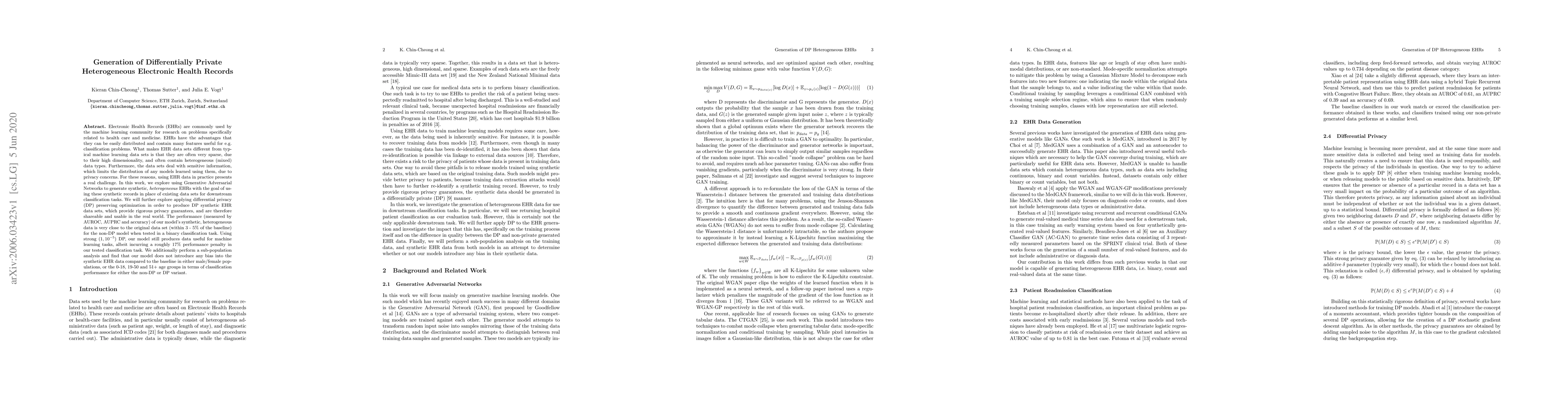 This paper explores generating synthetic, differentially private, heterogeneous Electronic Health Records (EHRs) using Generative Adversarial Networks to address privacy concerns while maintaining data utility for machine learning tasks. The synthetic EHRs show performance close to the original data, with a slight performance drop under strong differential privacy.