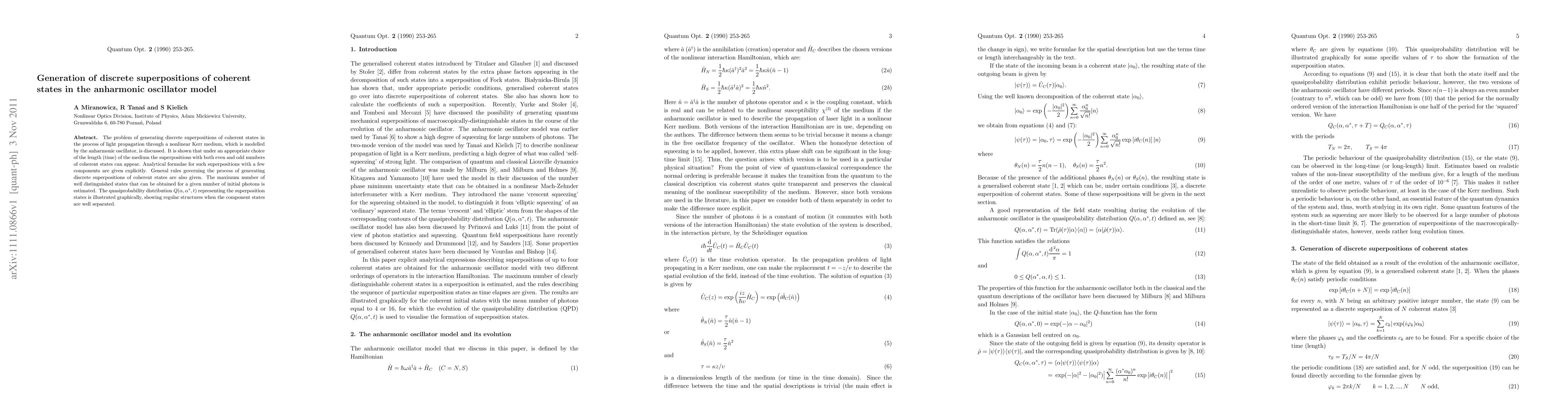 This paper explores generating discrete superpositions of coherent states in a nonlinear Kerr medium modeled by an anharmonic oscillator, providing analytical expressions for such superpositions and rules for their creation. It estimates the maximum number of distinguishable states for a given number of photons and graphically illustrates the quasiprobability distribution.