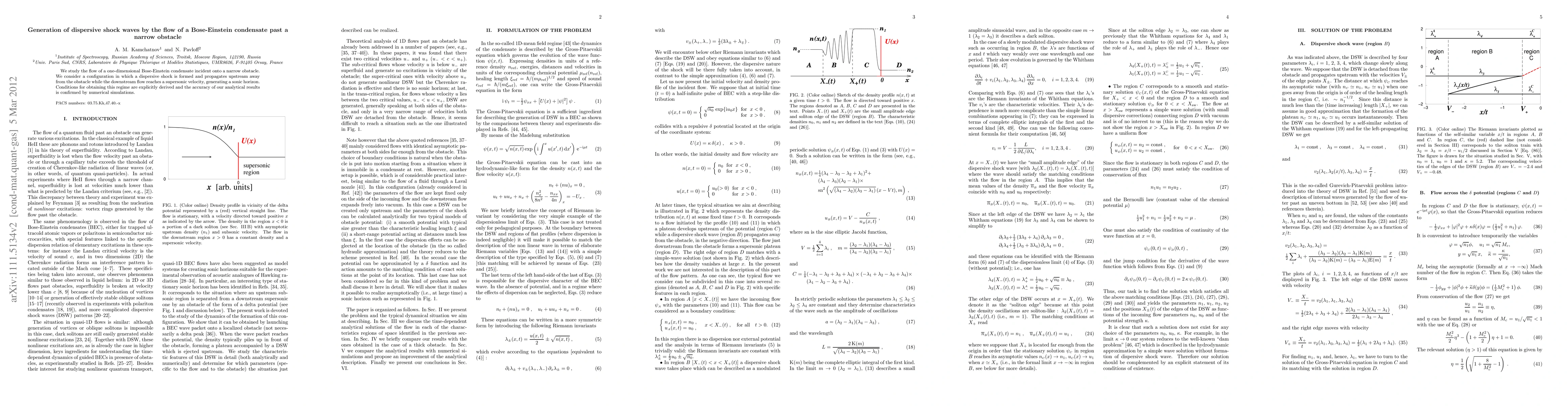 This paper investigates the formation of dispersive shock waves in a quasi-one-dimensional Bose-Einstein condensate flowing past a narrow obstacle, deriving conditions for upstream shock propagation and supersonic downstream flow, validated by numerical simulations.