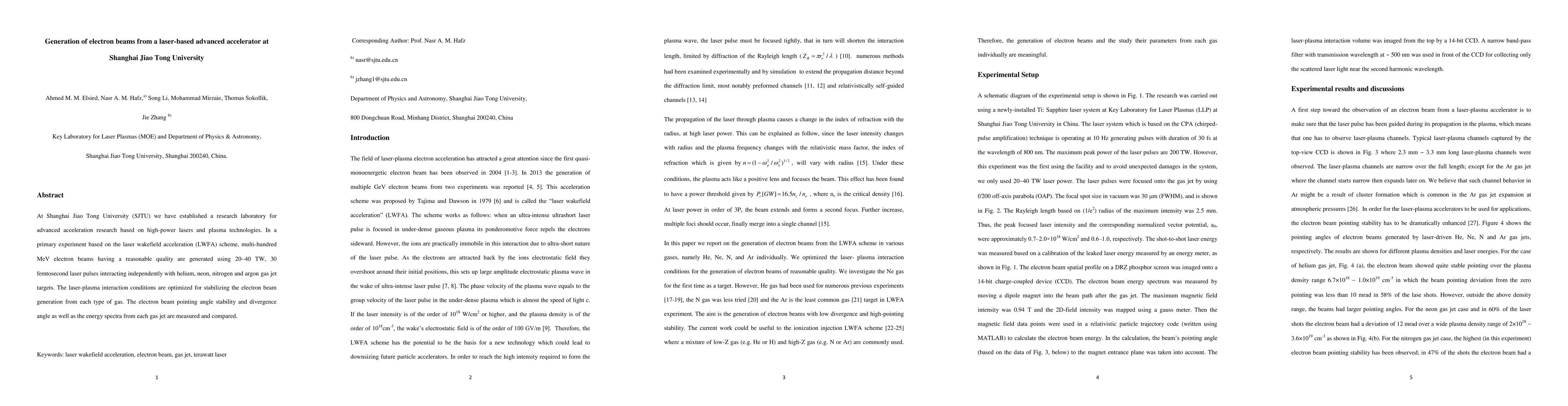 This research from Shanghai Jiao Tong University demonstrates the generation of high-energy electron beams using laser wakefield acceleration with 20-40 TW femtosecond laser pulses interacting with various gas targets. The study optimizes laser-plasma conditions for stable electron beam production and compares beam quality across different gases.