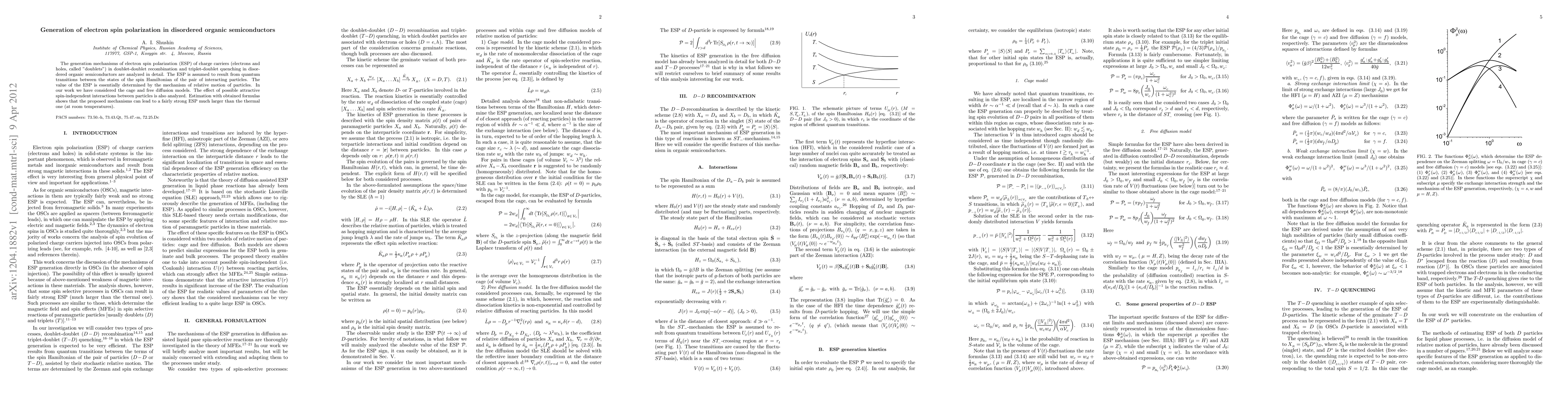 This paper analyzes the mechanisms generating electron spin polarization in disordered organic semiconductors through doublet-doublet recombination and triplet-doublet quenching. The study considers cage and free diffusion models, showing that these mechanisms can lead to significant spin polarization much greater than thermal levels at room temperature.