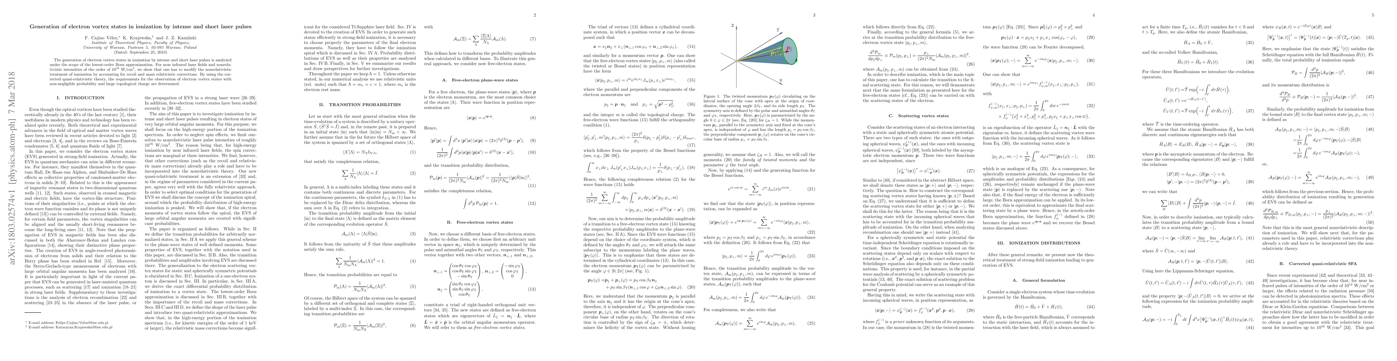 This paper investigates the generation of electron vortex states during ionization by intense, short laser pulses, employing a corrected quasi-relativistic theory to account for recoil and mass relativistic corrections. The conditions for observing these states with significant topological charge are determined.