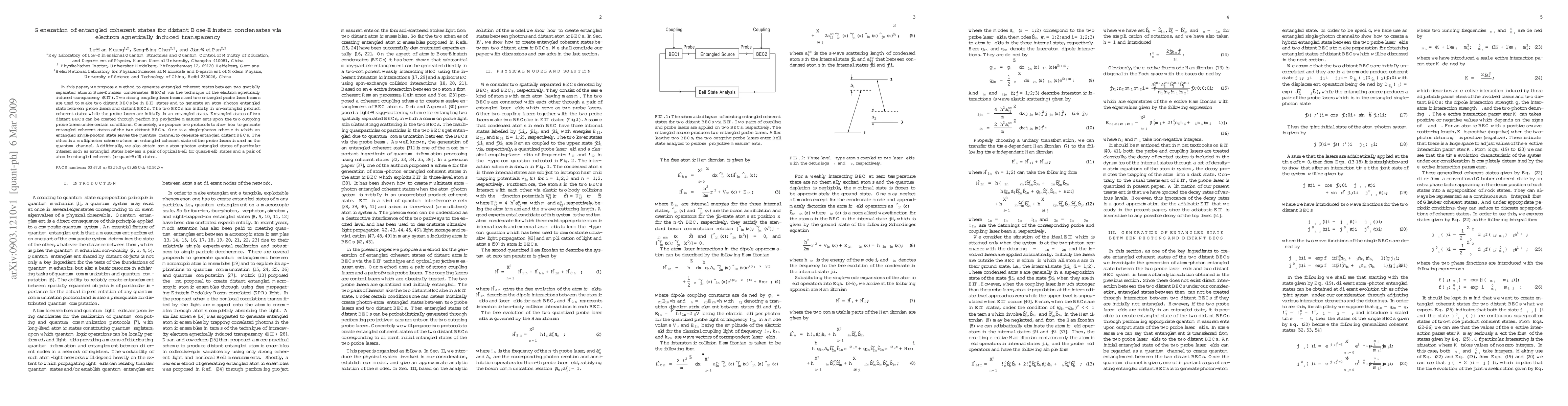 This paper proposes a method for generating entangled coherent states between two spatially separated Bose-Einstein condensates via electromagnetically induced transparency, utilizing strong coupling laser beams and entangled probe lasers to create atom-photon entangled states. The study presents two protocols: a single-photon scheme and a multiphoton scheme for generating entangled states between distant BECs.