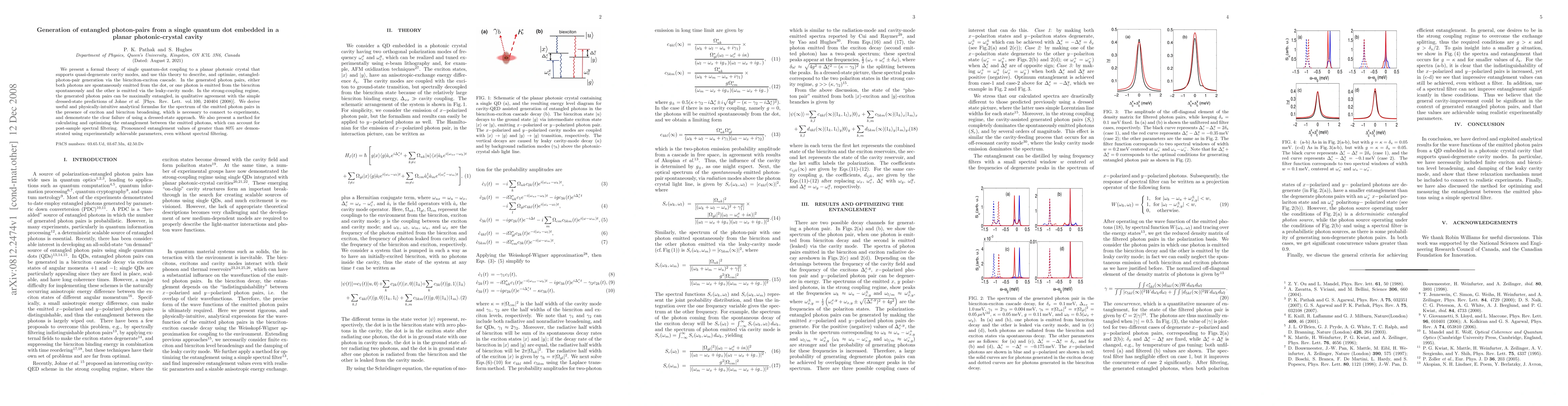 We present a formal theory of single quantum-dot coupling to a planar photonic crystal that supports quasi-degenerate cavity modes, and use this theory to describe, and optimize, entangled-photon-pair generation via the biexciton-exciton cascade. In the generated photon pairs, either both photons are spontaneously emitted from the dot, or one photon is emitted from the biexciton spontaneously and the other is emitted via the leaky-cavity mode. In the strong-coupling regime, the generated photon pairs can be maximally entangled, in qualitative agreement with the simple dressed-state predictions of Johne {\em et al.} [Phys. Rev. Lett. vol. 100, 240404 (2008)]. We derive useful and physically-intuitive analytical formulas for the spectrum of the emitted photon pairs in the presence of exciton and biexciton broadening, which is necessary to connect to experiments, and demonstrate the clear failure of using a dressed-state approach. We also present a method for calculating and optimizing the entanglement between the emitted photons, which can account for post-sample spectral filtering. Pronounced entanglement values of greater than 80% are demonstrated using experimentally achievable parameters, even without spectral filtering.