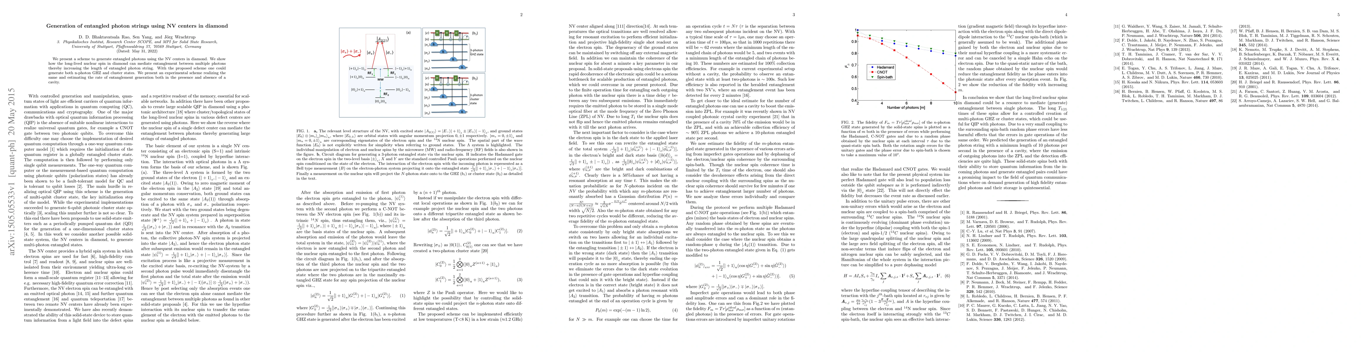 This paper proposes a method to generate entangled photon strings using NV centers in diamond, leveraging the long-lived nuclear spin to mediate entanglement. Experimental results demonstrate the generation of both n-photon GHZ and cluster states, with estimates of entanglement generation rates in both cavity and free-space conditions.