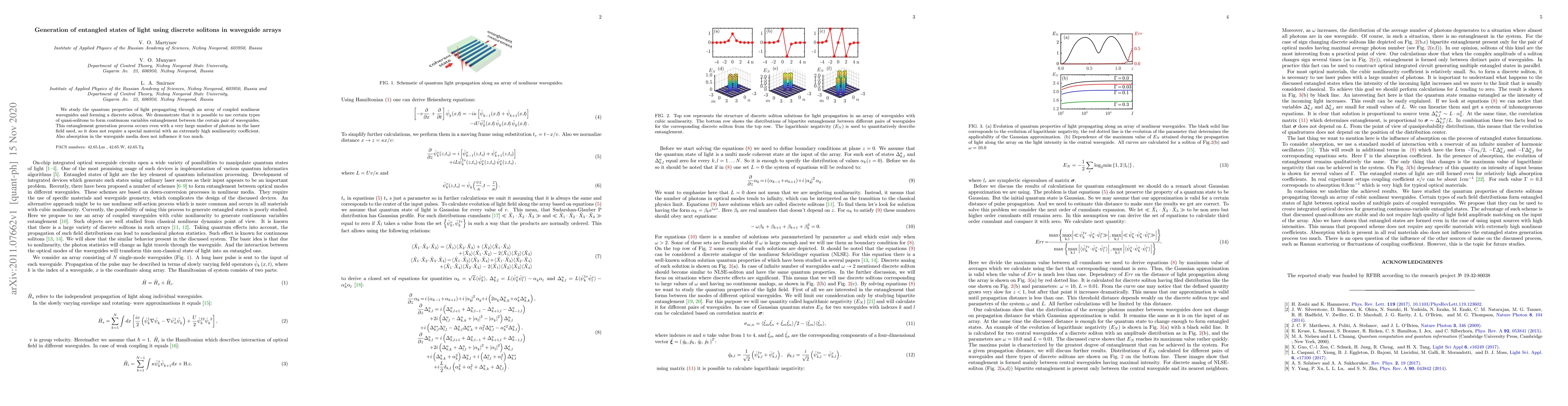 This paper investigates the generation of entangled states of light via discrete solitons in coupled nonlinear waveguide arrays, demonstrating continuous variable entanglement using quasi-solitons without requiring high nonlinearity or being significantly affected by absorption.