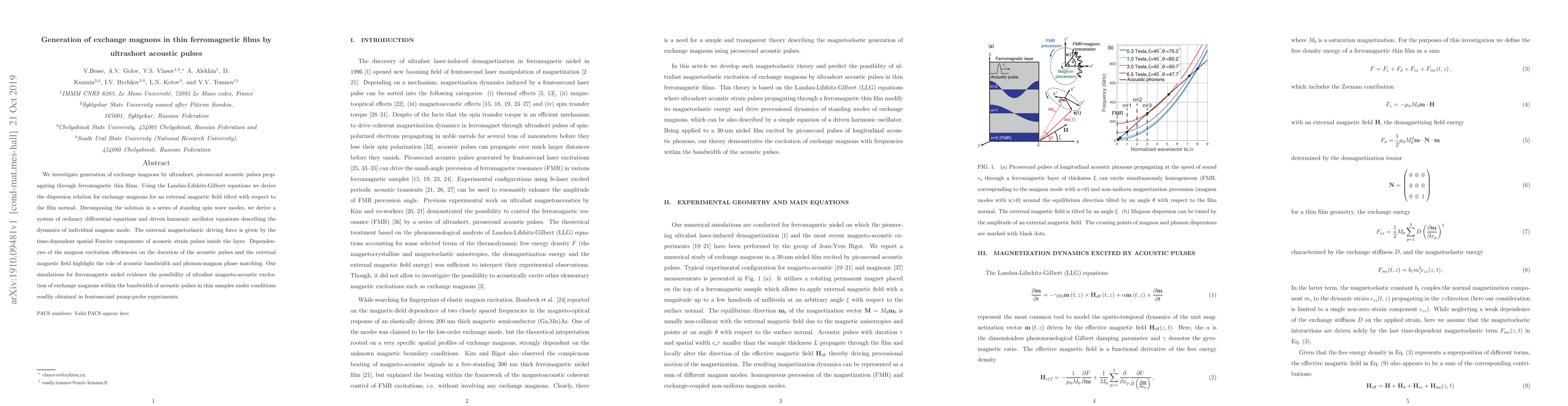 This paper explores the generation of exchange magnons in thin ferromagnetic films via ultrashort acoustic pulses, deriving a dispersion relation and dynamics using the Landau-Lifshitz-Gilbert equations. Simulations show the potential for ultrafast magneto-acoustic excitation of exchange magnons in nickel films, highlighting the importance of acoustic bandwidth and phonon-magnon phase matching.