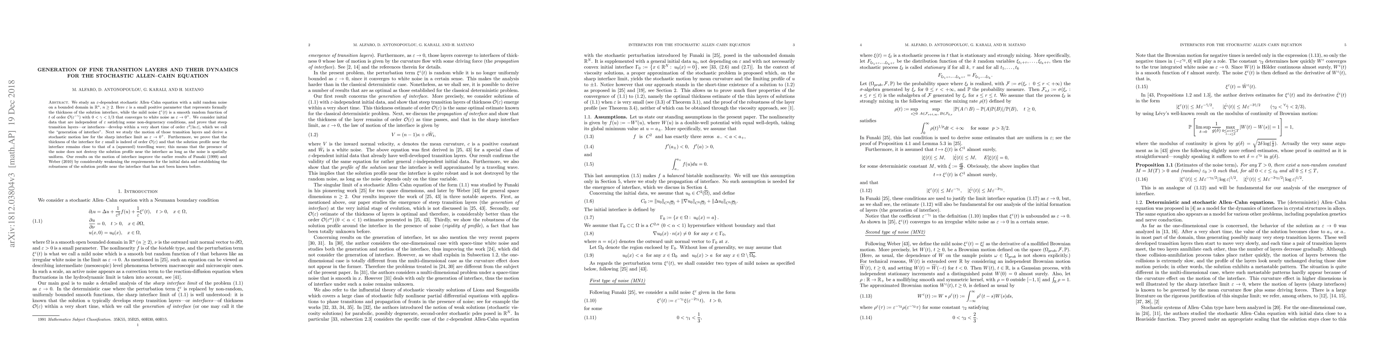 We study an $\ep$-dependent stochastic Allen--Cahn equation with a mild random noise on a bounded domain in $\mathbb{R}^n$, $n\geq 2$. Here $\ep$ is a small positive parameter that represents formally the thickness of the solution interface, while the mild noise $\xi^\ep(t)$ is a smooth random function of $t$ of order $\mathcal O(\ep^{-\gamma})$ with $0<\gamma<1/3$ that converges to white noise as $\ep\rightarrow 0^+$. We consider initial data that are independent of $\ep$ satisfying some non-degeneracy conditions, and prove that steep transition layers---or interfaces---develop within a very short time of order $\ep^2|\ln\ep|$, which we call the "generation of interface". Next we study the motion of those transition layers and derive a stochastic motion law for the sharp interface limit as $\ep\rightarrow 0^+$. Furthermore, we prove that the thickness of the interface for $\ep$ small is indeed of order $\mathcal O(\ep)$ and that the solution profile near the interface remains close to that of a (squeezed) travelling wave, this means that the presence of the noise does not destroy the solution profile near the interface as long as the noise is spatially uniform. Our results on the motion of interface improve the earlier results of Funaki (1999) and Weber (2010) by considerably weakening the requirements for the initial data and establishing the robustness of the solution profile near the interface that has not been known before.