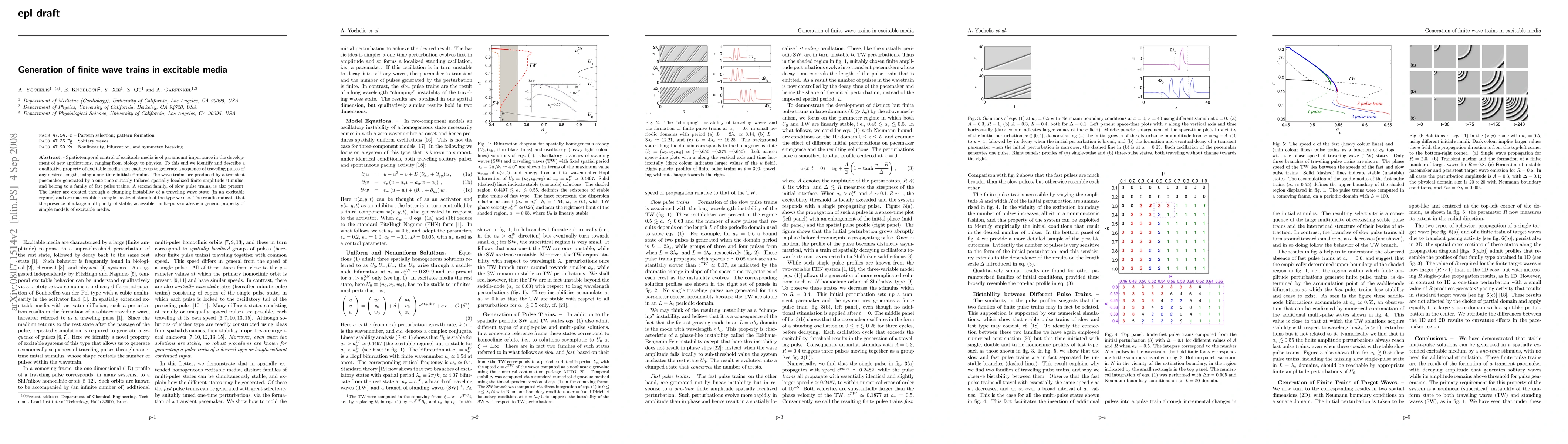 This paper explores the generation of finite wave trains in excitable media, demonstrating the ability to produce sequences of traveling pulses of any desired length using a single initial stimulus. It identifies two families of pulse trains, fast and slow, with the fast trains generated through a transient pacemaker and the slow trains via clumping instability.