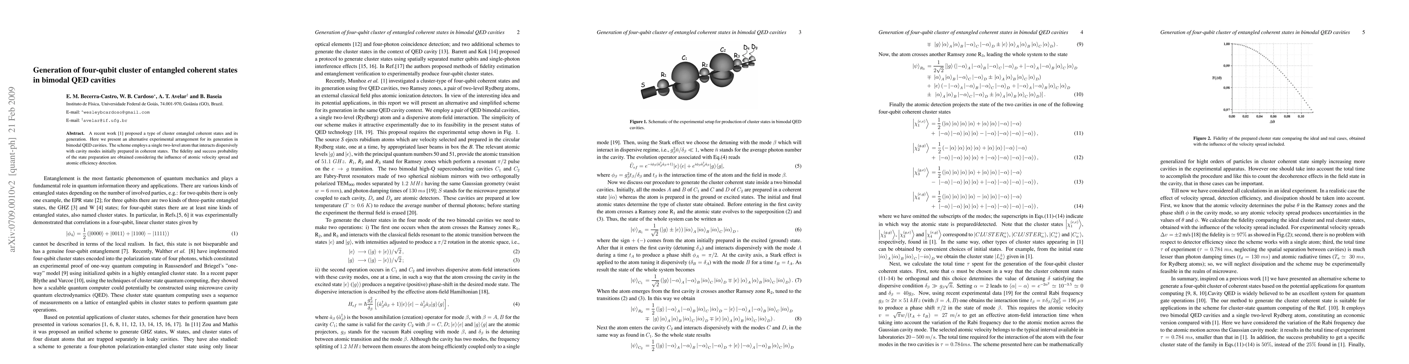 This paper proposes an experimental setup for generating a four-qubit cluster of entangled coherent states using bimodal QED cavities, employing a single two-level atom interacting dispersively with cavity modes. The study evaluates the fidelity and success probability for state preparation, accounting for atomic velocity spread and detection efficiency.