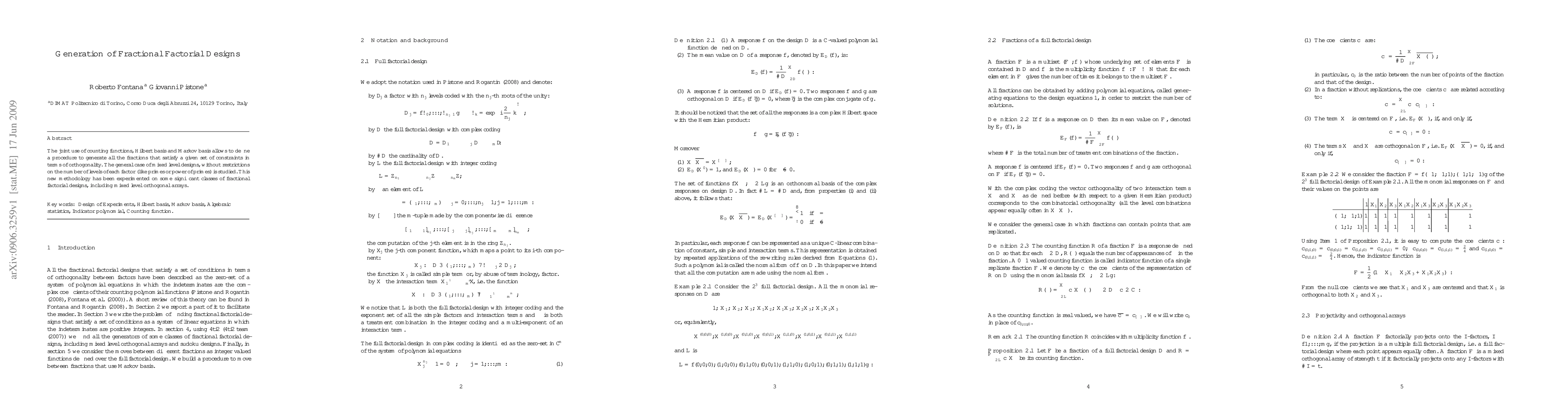 This paper proposes a novel methodology for generating fractional factorial designs using counting functions, Hilbert basis, and Markov basis, applicable to mixed level designs without level restrictions. It successfully experiments on significant classes of fractional factorial designs, including mixed level orthogonal arrays.