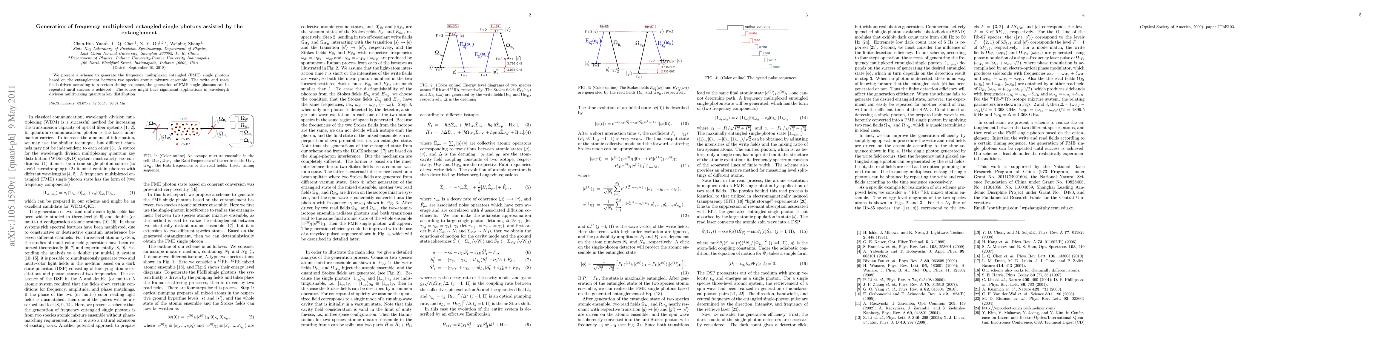 Summary: This paper proposes a method for generating frequency multiplexed entangled single photons using an atomic mixture ensemble. The technique involves controlled write and read fields to achieve successful entanglement generation, with potential applications in quantum key distribution via wavelength division multiplexing.