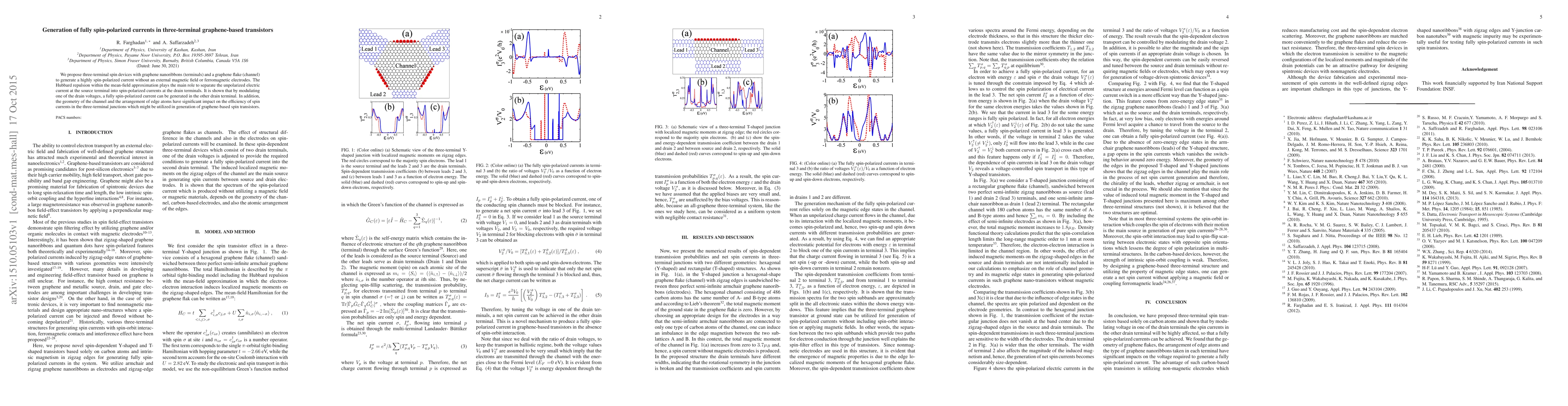 This research proposes a method for generating fully spin-polarized currents in three-terminal graphene-based transistors using graphene nanoribbons and a graphene flake, driven by Hubbard repulsion without external magnetic fields. Modulating one drain voltage allows the generation of a spin-polarized current in the other drain, highlighting the significant impact of channel geometry and edge atoms on spin current efficiency.