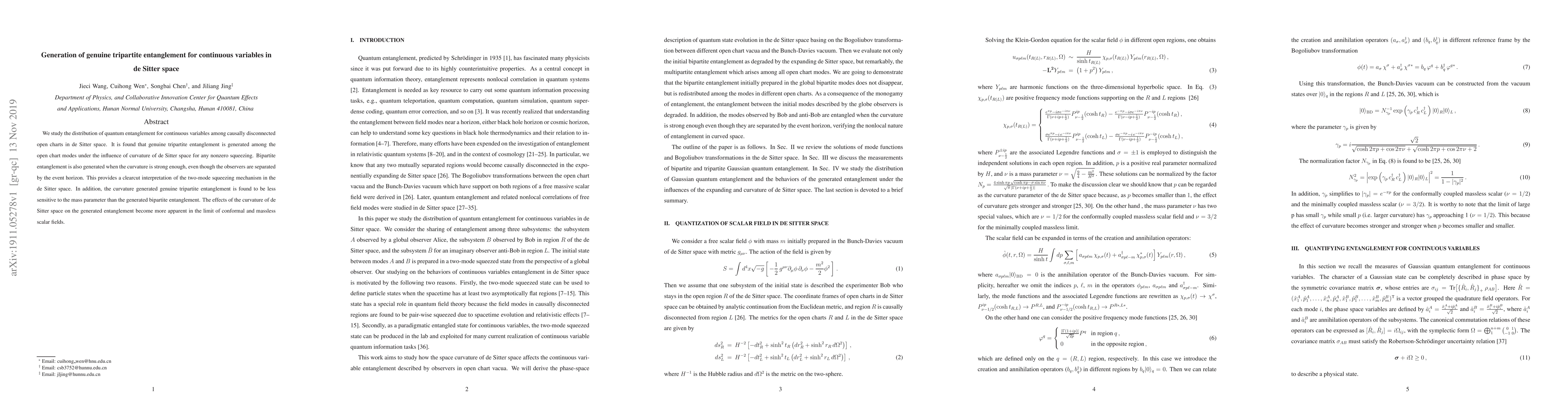 This paper investigates the generation of genuine tripartite entanglement among continuous variable modes in de Sitter space, revealing that the curvature induces such entanglement regardless of squeezing, and also generates bipartite entanglement under strong curvature conditions despite separation by an event horizon. The study finds that tripartite entanglement is more robust to mass variations compared to bipartite entanglement.