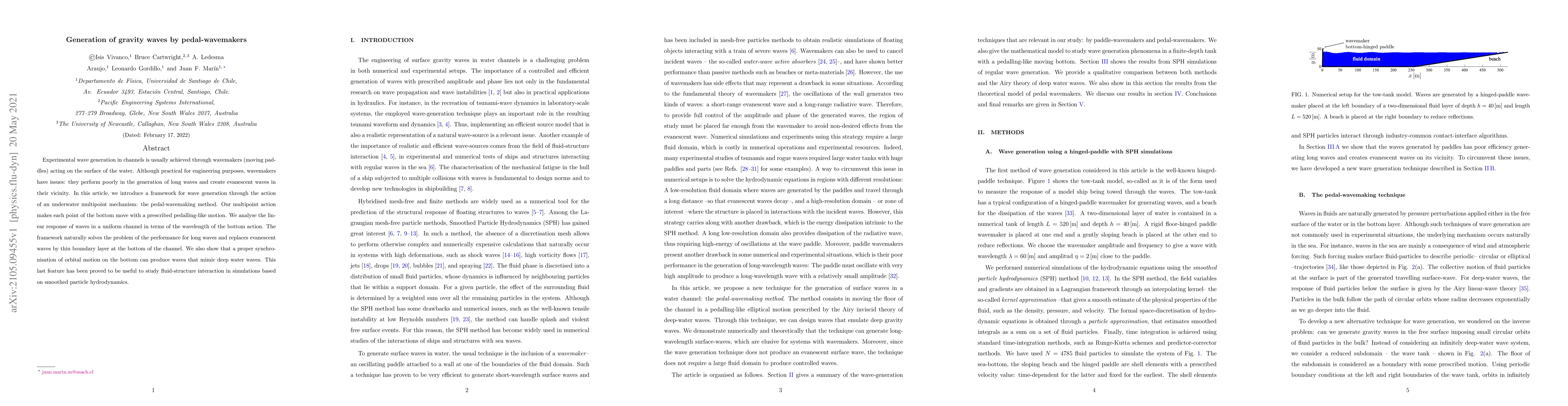 Experimental wave generation in channels is usually achieved through wavemakers (moving paddles) acting on the surface of the water. Although practical for engineering purposes, wavemakers have issues: they perform poorly in the generation of long waves and create evanescent waves in their vicinity. In this article, we introduce a framework for wave generation through the action of an underwater multipoint mechanism: the pedal-wavemaking method. Our multipoint action makes each point of the bottom move with a prescribed pedalling-like motion. We analyse the linear response of waves in a uniform channel in terms of the wavelength of the bottom action. The framework naturally solves the problem of the performance for long waves and replaces evanescent waves by thin boundary layer at the bottom of the channel. We also show that a proper synchronisation of orbital motion on the bottom can produce waves that mimic deep water waves. This last feature has been proved to be useful to study fluid-structure interaction in simulations based on smoothed particle hydrodynamics.