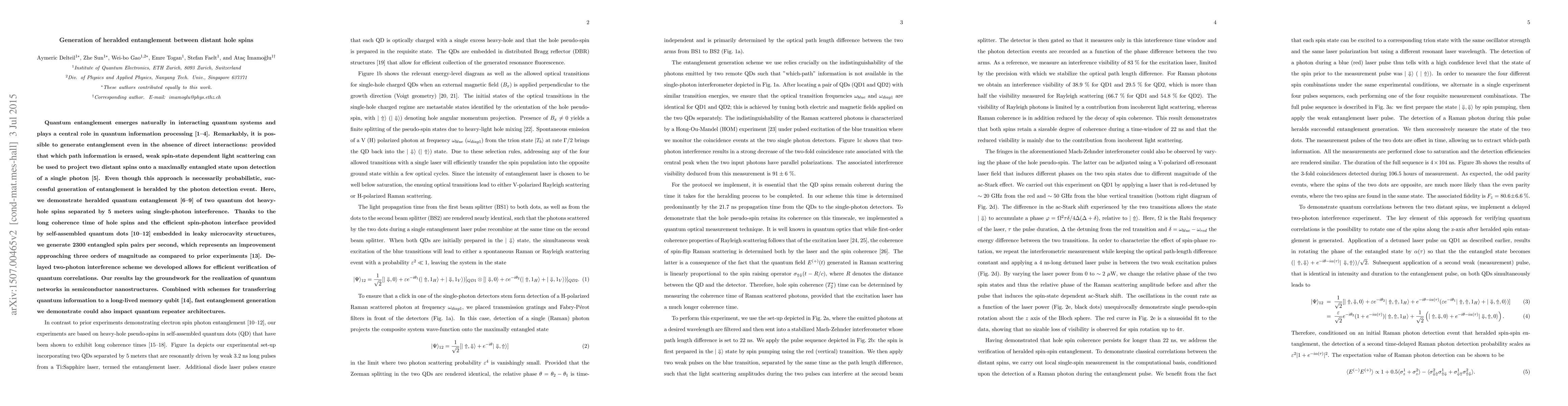 This paper demonstrates the generation of heralded entanglement between distant quantum dot heavy-hole spins separated by 5 meters using single-photon interference, achieving a rate of 2300 entangled pairs per second. The method leverages weak spin-state dependent light scattering and self-assembled quantum dots in leaky microcavities for efficient spin-photon coupling, paving the way for quantum networks and repeaters.
