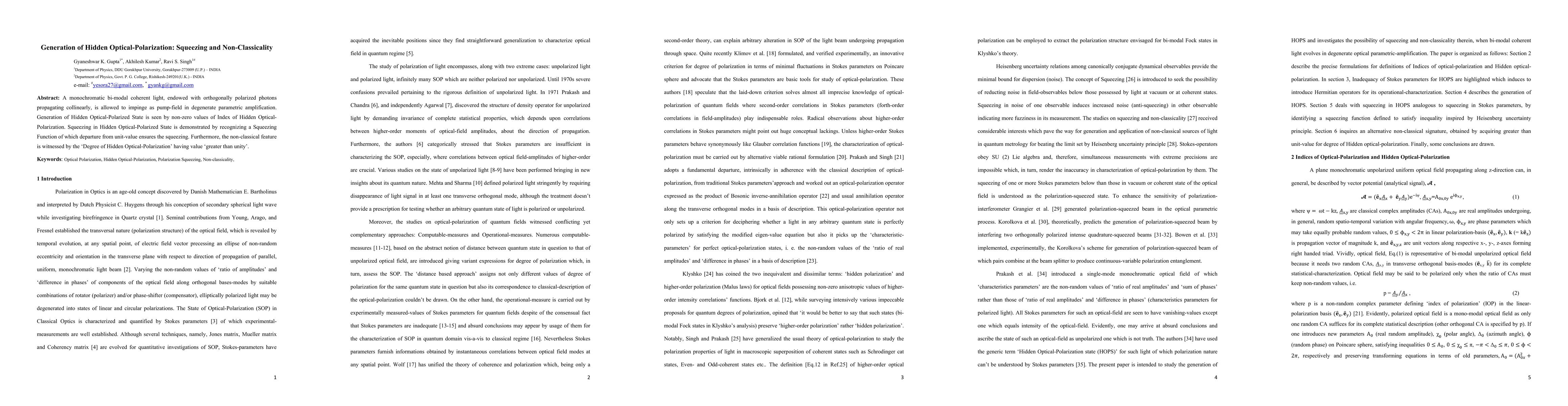 This paper investigates the generation of Hidden Optical-Polarization States (HOPS) through Degenerate Parametric Amplification, demonstrating squeezing and non-classicality through specific indices and functions, with non-classical features observed by values exceeding unity. Numerical simulations illustrate the dynamic processes involved.