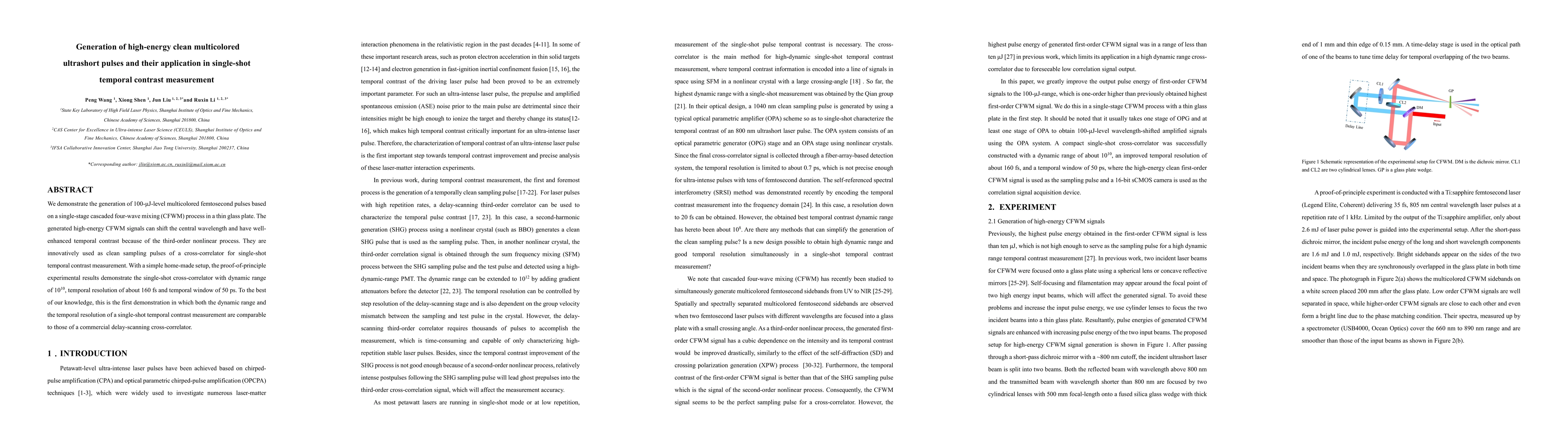 This paper presents a method for generating high-energy, multicolored femtosecond pulses via a single-stage cascaded four-wave mixing process, enabling single-shot temporal contrast measurement with a dynamic range of 10^10 and a temporal resolution of 160 fs. The technique uses these pulses in a novel cross-correlator setup, demonstrating a significant advancement in temporal resolution and dynamic range compared to commercial alternatives.