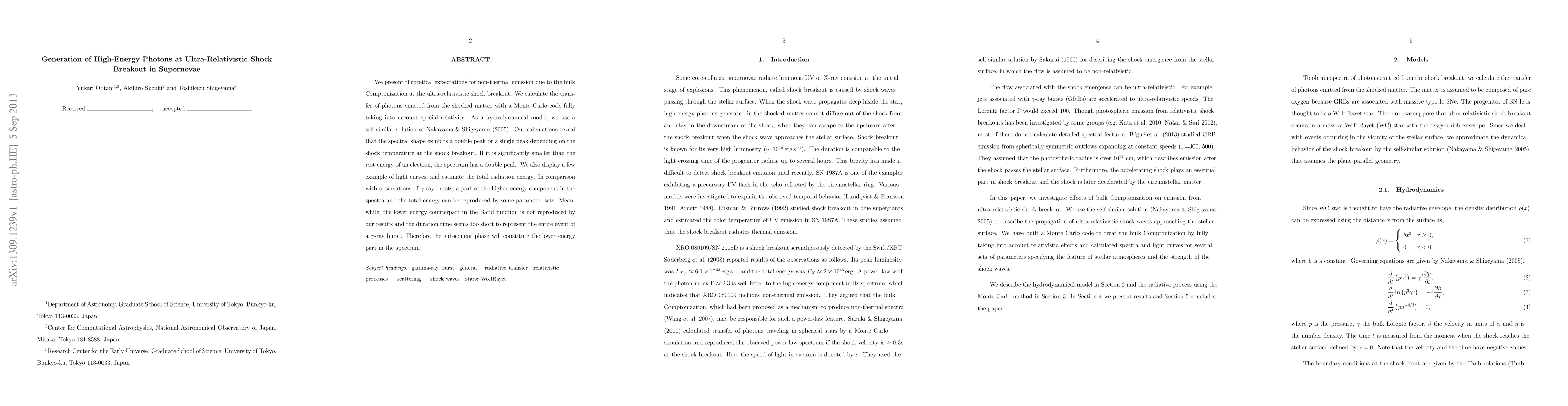 We present theoretical expectations for non-thermal emission due to the bulk Comptonization at the ultra-relativistic shock breakout. We calculate the transfer of photons emitted from the shocked matter with a Monte Carlo code fully taking into account special relativity. As a hydrodynamical model, we use a self-similar solution of Nakayama & Shigeyama (2005). Our calculations reveal that the spectral shape exhibits a double peak or a single peak depending on the shock temperature at the shock breakout. If it is significantly smaller than the rest energy of an electron, the spectrum has a double peak. We also display a few example of light curves, and estimate the total radiation energy. In comparison with observations of gamma-ray bursts, a part of the higher energy component in the spectra and the total energy can be reproduced by some parameter sets. Meanwhile, the lower energy counterpart in the Band function is not reproduced by our results and the duration time seems too short to represent the entire event of a gamma-ray burst. Therefore the subsequent phase will constitute the lower energy part in the spectrum.