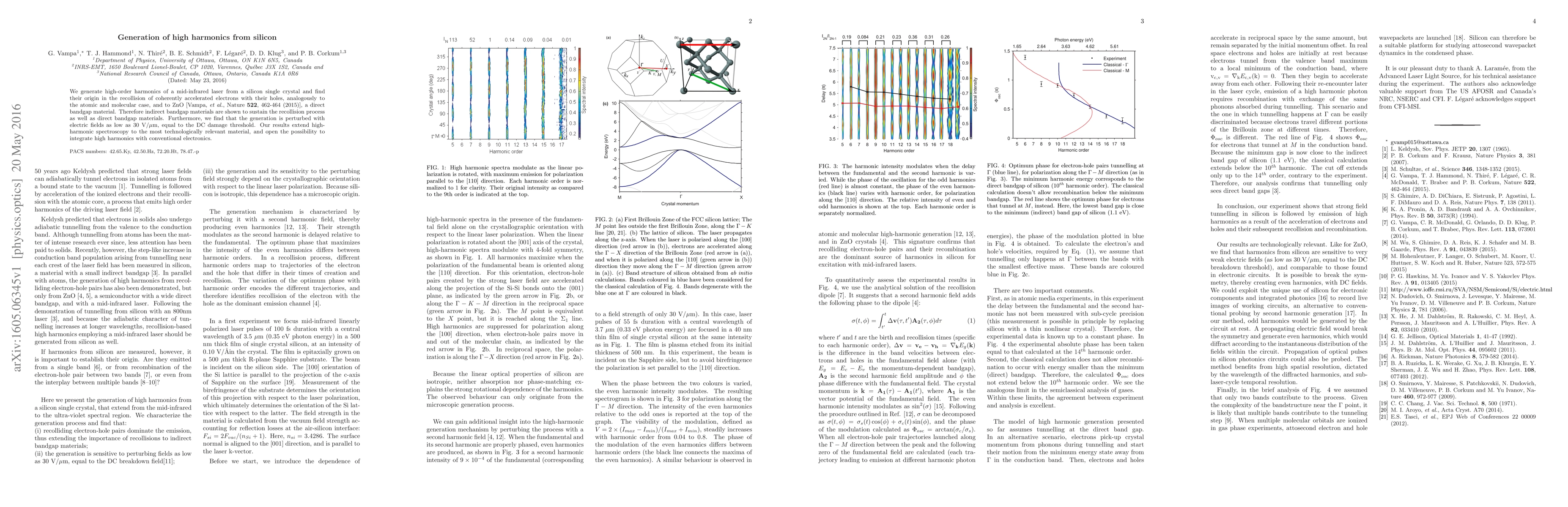 This research demonstrates the generation of high-order harmonics from a silicon single crystal, showing that indirect bandgap materials can sustain the recollision process, similar to direct bandgap materials. The study also reveals that the process is disrupted by weak electric fields, suggesting potential integration of high harmonics with conventional electronics, thus extending high-harmonic spectroscopy to the most technologically relevant material.