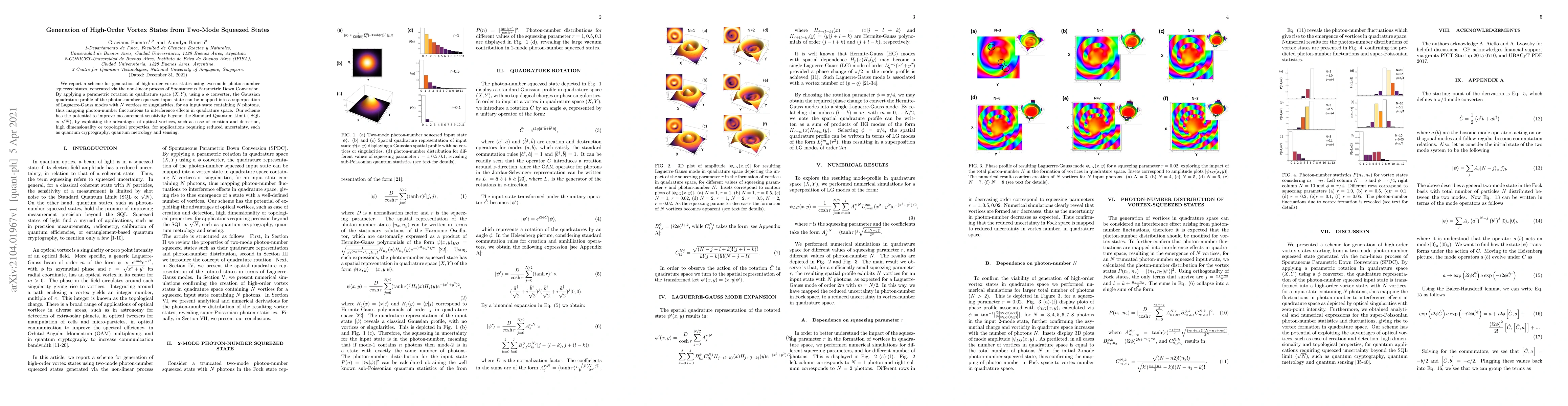 We report a scheme for generation of high-order vortex states using two-mode photon-number squeezed states, generated via the non-linear process of Spontaneous Parametric Down Conversion. By applying a parametric rotation in quadrature space $(X,Y)$, using a $\phi$ converter, the Gaussian quadrature profile of the photon-number squeezed input state can be mapped into a superposition of Laguerre-Gauss modes with $N$ vortices or singularities, for an input state containing $N$ photons, thus mapping photon-number fluctuations to interference effects in quadrature space. Our scheme has the potential to improve measurement sensitivity beyond the Standard Quantum Limit (SQL $\propto \sqrt{N}$), by exploiting the advantages of optical vortices, such as ease of creation and detection, high dimensionality or topological properties, for applications requiring reduced uncertainty, such as quantum cryptography, quantum metrology and sensing.