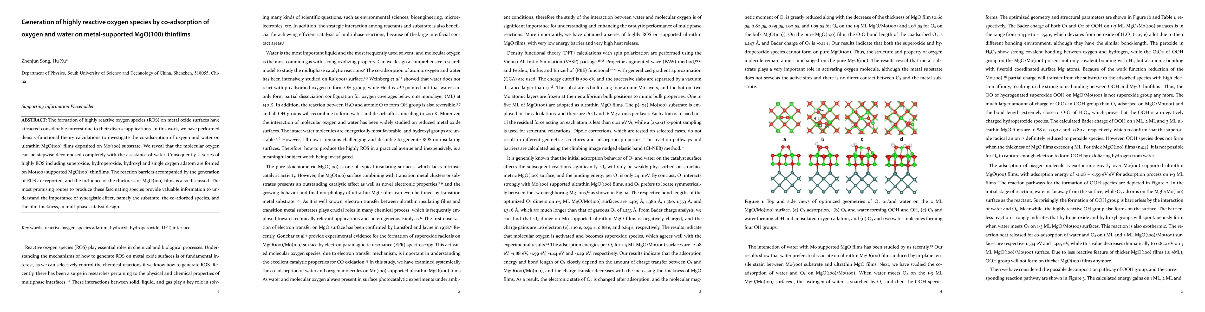This study uses density-functional theory to explore how co-adsorption of oxygen and water on MgO(100) thin films on a Mo(100) substrate generates highly reactive oxygen species, including superoxide and hydroxyl. The research highlights the importance of synergistic effects from the substrate, co-adsorption, and film thickness in catalyst design.