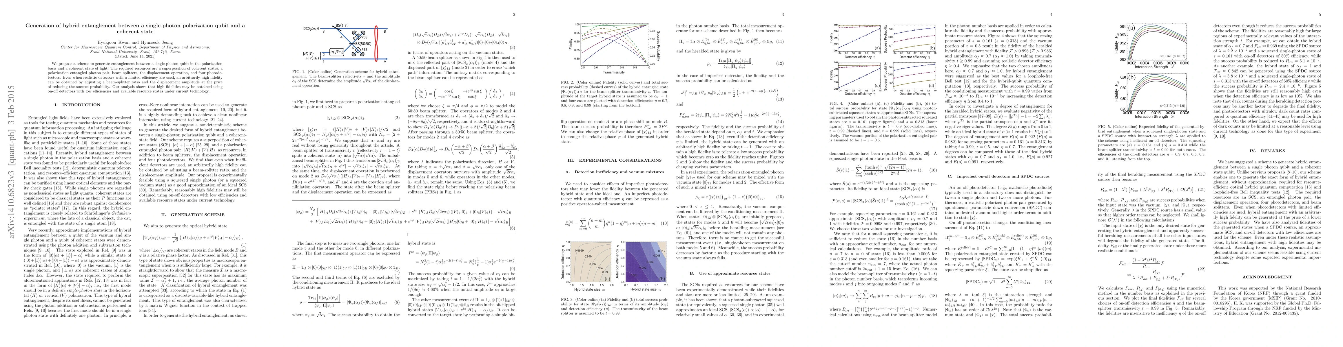 This paper proposes a method to generate hybrid entanglement between a single-photon polarization qubit and a coherent state using a combination of coherent states, entangled photon pairs, beam splitters, and displacement operations. Despite limited detector efficiency, the scheme can achieve high fidelity entanglement by adjusting parameters, demonstrating feasibility with current technology.