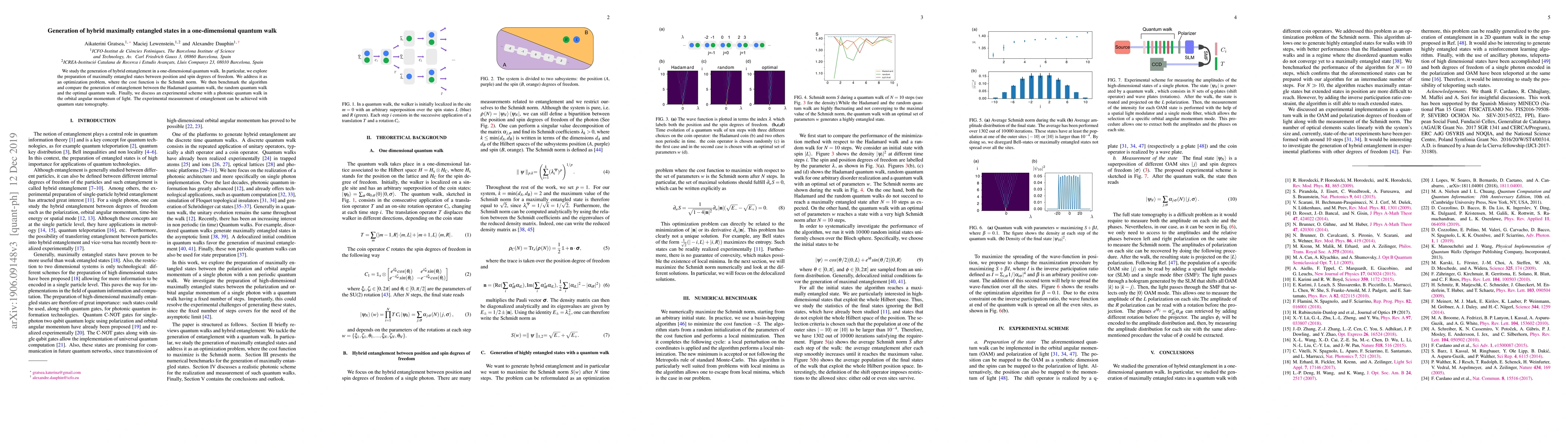 This paper explores generating hybrid maximally entangled states in a one-dimensional quantum walk, focusing on entanglement between position and spin. It formulates the task as an optimization problem using the Schmidt norm and compares different quantum walk methods, concluding with an experimental proposal for photonic quantum walks using orbital angular momentum.