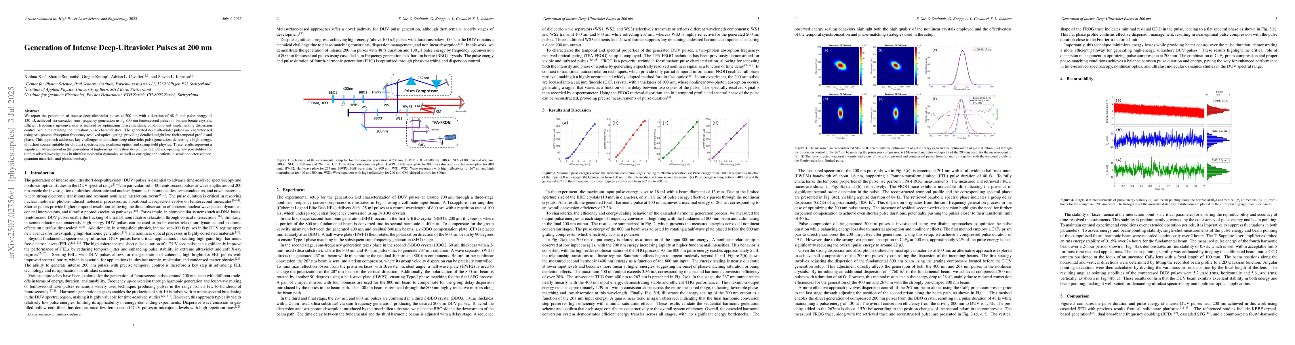 The research paper details the generation of intense deep ultraviolet pulses at 200 nm with a duration of 48 fs and pulse energy of 130 µJ. This was accomplished through cascaded sum frequency generation using 800 nm femtosecond pulses in barium borate crystals, optimizing phase-matching conditions and dispersion control.