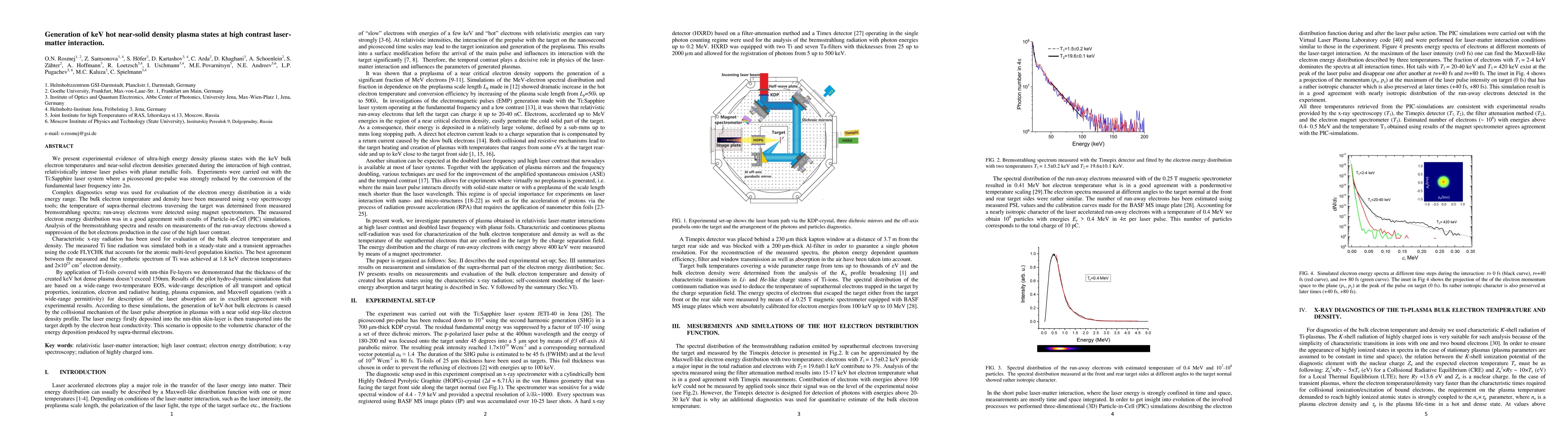 We present experimental evidence of ultra-high energy density plasma states with the keV bulk electron temperatures and near-solid electron densities generated during the interaction of high contrast, relativistically intense laser pulses with planar metallic foils. The bulk electron temperature and density have been measured using x-ray spectroscopy tools; the temperature of supra-thermal electrons traversing the target was determined from measured bremsstrahlung spectra; run-away electrons were detected using magnet spectrometers. The measured electron energy distribution was in a good agreement with results of Particle-in-Cell (PIC) simulations. Analysis of the bremsstrahlung spectra and results on measurements of the run-away electrons showed a suppression of the hot electrons production in the case of the high laser contrast. By application of Ti-foils covered with nm-thin Fe-layers we demonstrated that the thickness of the created keV hot dense plasma does not exceed 150 nm. Results of the pilot hydro-dynamic simulations that are based on a wide-range two-temperature EOS, wide-range description of all transport and optical properties, ionization, electron and radiative heating, plasma expansion, and Maxwell equations (with a wide-range permittivity) for description of the laser absorption are in excellent agreement with experimental results. According to these simulations, the generation of keV-hot bulk electrons is caused by the collisional mechanism of the laser pulse absorption in plasmas with a near solid step-like electron density profile. The laser energy firstly deposited into the nm-thin skin-layer is then transported into the target depth by the electron heat conductivity. This scenario is opposite to the volumetric character of the energy deposition produced by supra-thermal electrons.