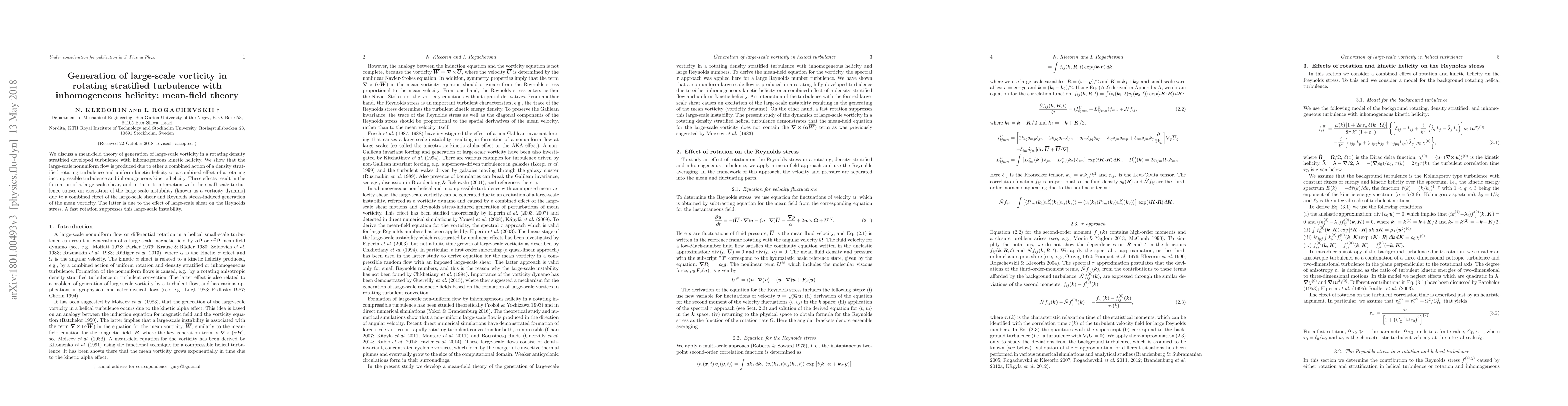 This paper proposes a mean-field theory explaining the generation of large-scale vorticity in rotating, stratified turbulence with inhomogeneous helicity. It identifies that large-scale shear arises from either stratified rotating turbulence with uniform kinetic helicity or rotating incompressible turbulence with inhomogeneous kinetic helicity, leading to a vorticity dynamo effect.