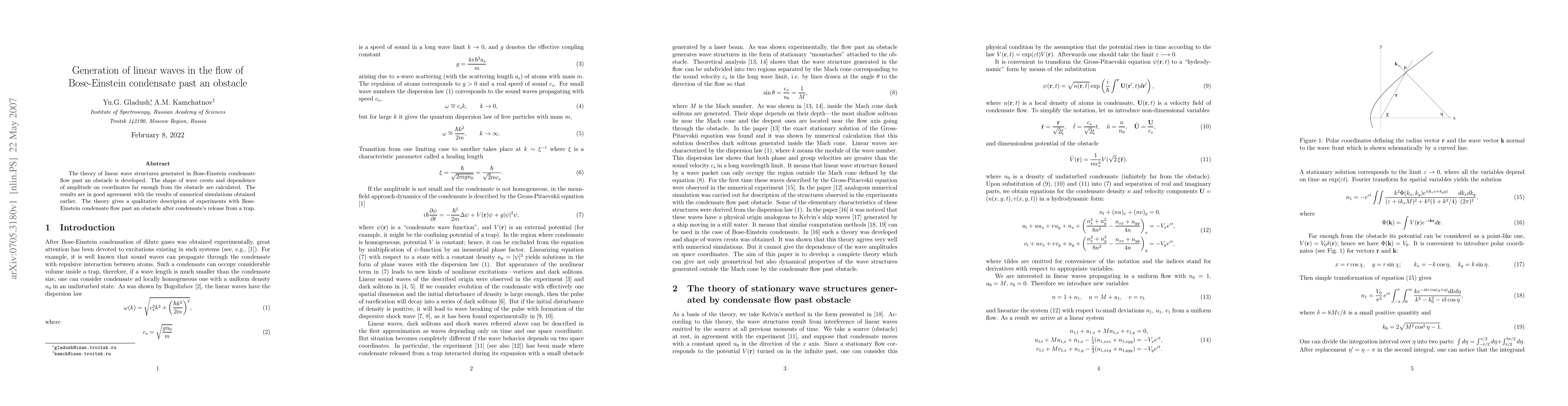 This paper develops a theoretical framework for linear wave generation in Bose-Einstein condensates flowing past an obstacle, calculating wave crest shapes and amplitude dependence. The findings align well with prior numerical simulations and qualitatively describe experimental observations.