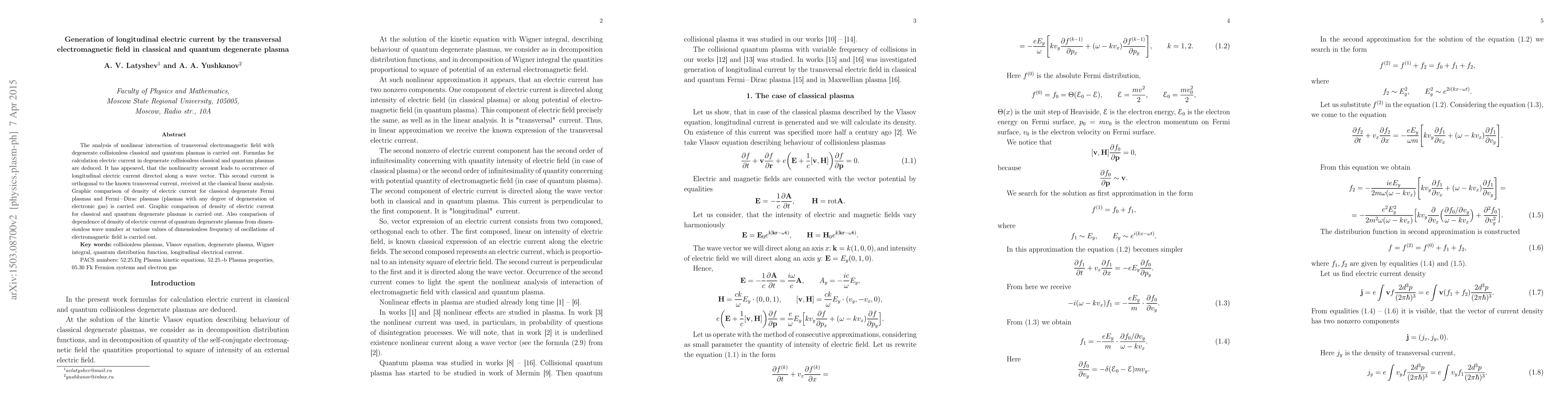 This paper investigates the nonlinear interaction of a transversal electromagnetic field with degenerate collisionless plasmas, deriving formulas that show the generation of a longitudinal electric current orthogonal to the classical transversal current. The study compares electric current densities and dependencies in classical and quantum degenerate plasmas.