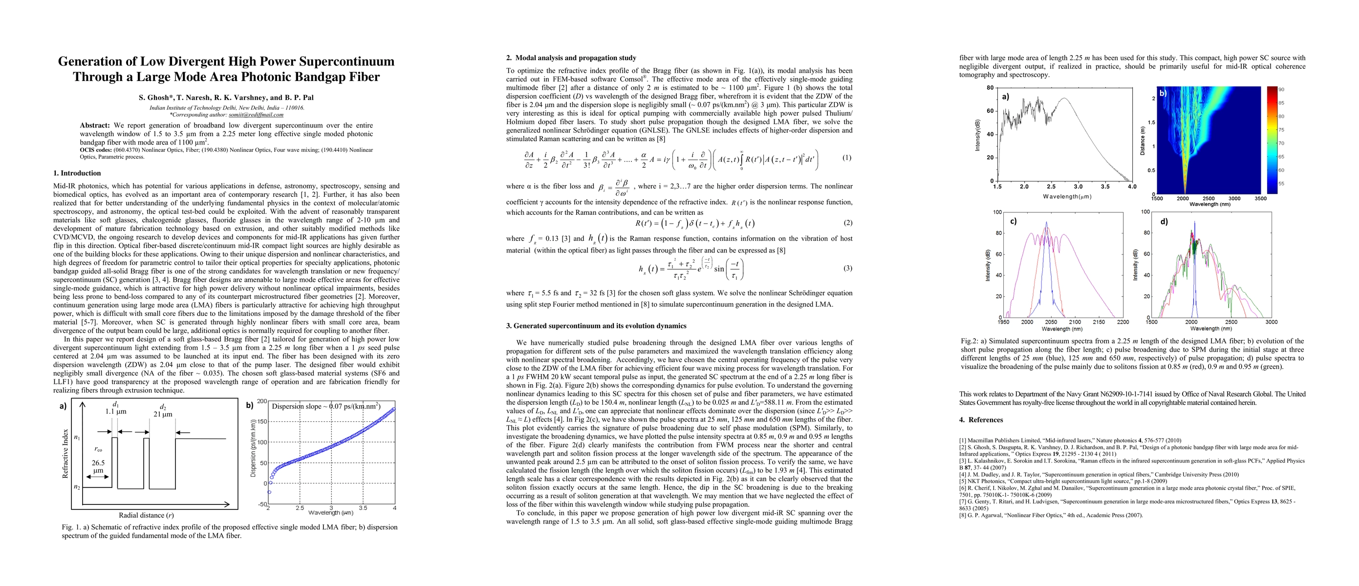 This research demonstrates the creation of a broadband, low divergent supercontinuum spanning from 1.5 to 3.5 μm using a 2.25-meter long photonic bandgap fiber with a large mode area of 1100 μm². The fiber's unique structure facilitates high power generation.