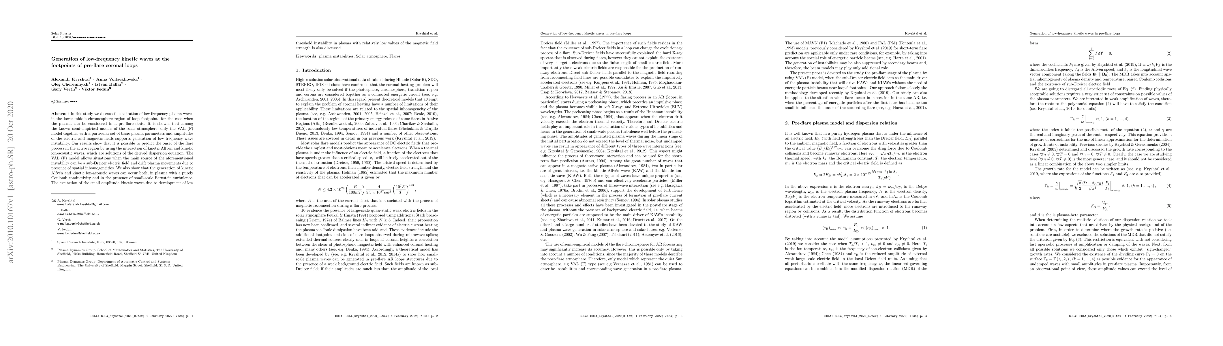 Research finds that low-frequency kinetic waves can be generated at loop footpoints of pre-flare coronal loops using the VAL (F) model, allowing for prediction of flare onset through interaction between Alfven and ion-acoustic waves.