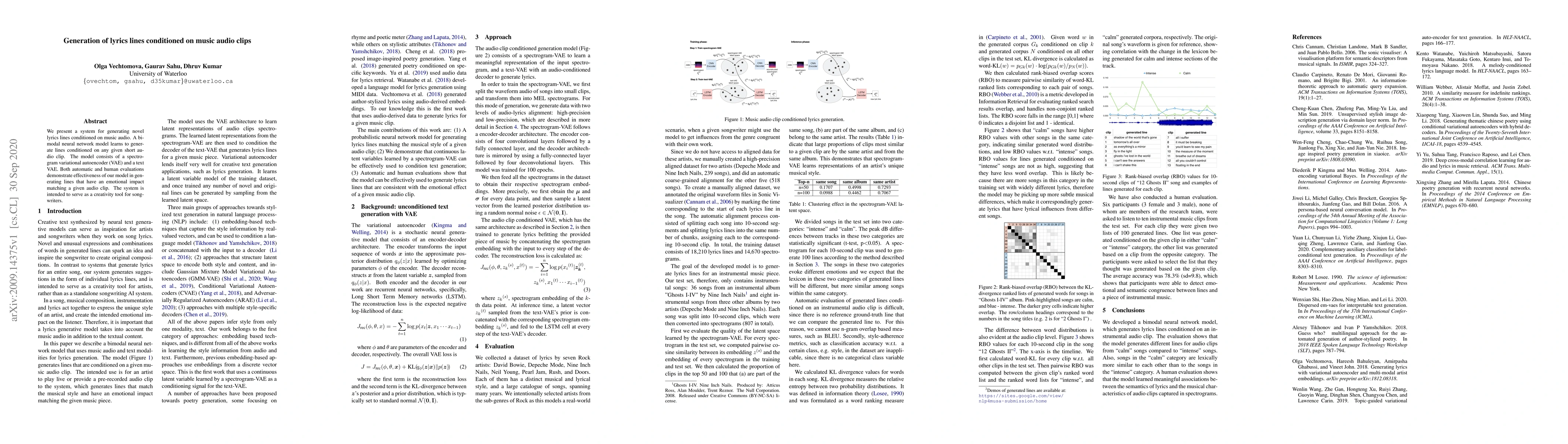 We present a system for generating novel lyrics lines conditioned on music audio. A bimodal neural network model learns to generate lines conditioned on any given short audio clip. The model consists of a spectrogram variational autoencoder (VAE) and a text VAE. Both automatic and human evaluations demonstrate effectiveness of our model in generating lines that have an emotional impact matching a given audio clip. The system is intended to serve as a creativity tool for songwriters.