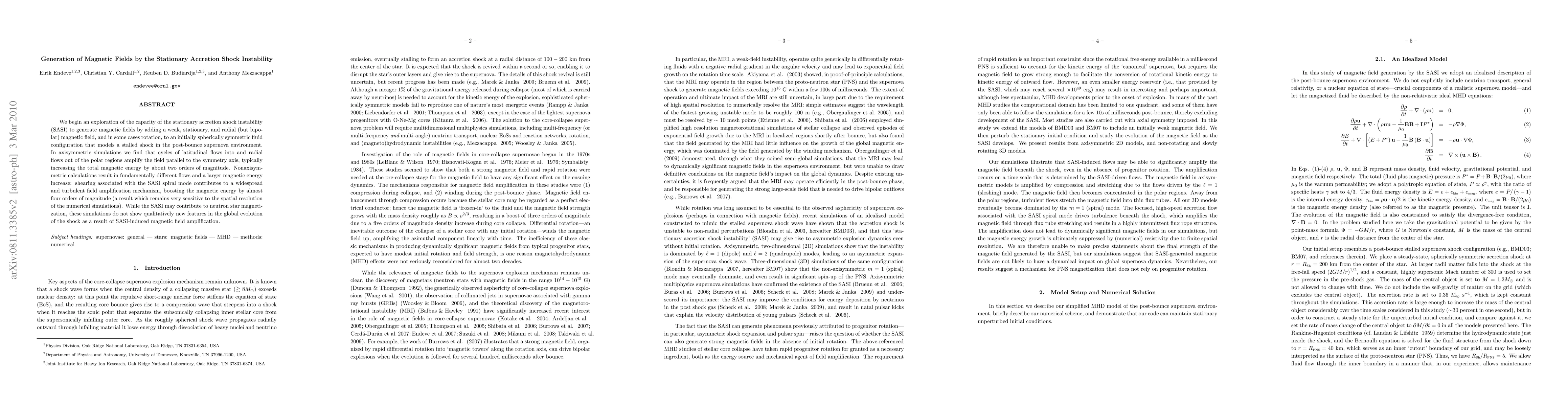 This paper explores how the stationary accretion shock instability (SASI) can generate magnetic fields in a post-bounce supernova environment. It finds that SASI can amplify magnetic fields by two orders of magnitude in axisymmetric flows and by nearly four orders of magnitude in nonaxisymmetric flows, though it does not significantly alter the global shock evolution.