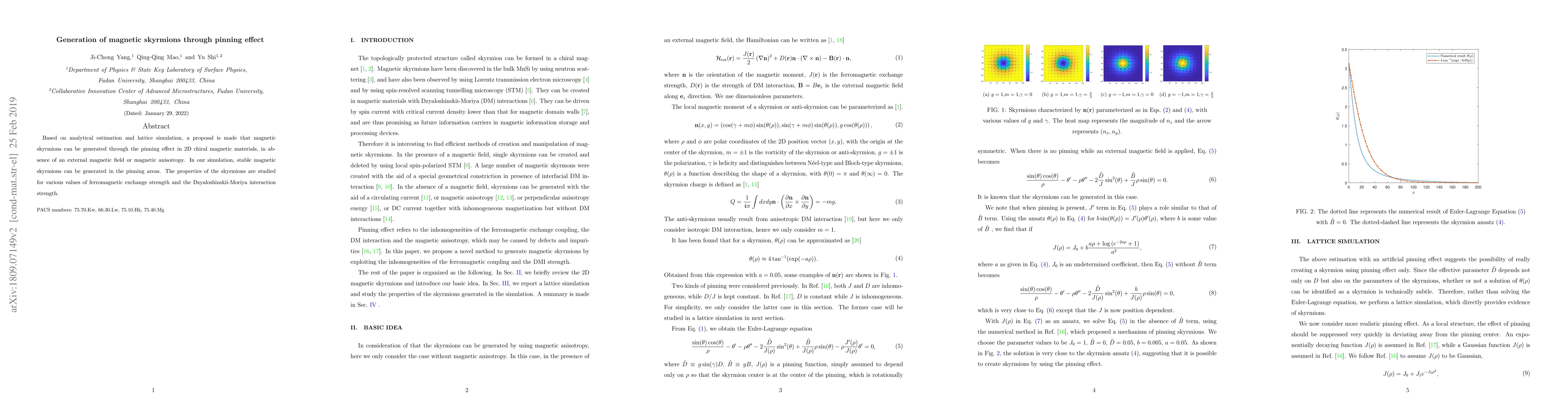 This paper proposes that magnetic skyrmions can be generated via the pinning effect in 2D chiral magnetic materials without external magnetic fields or anisotropy. Simulations show stable skyrmions in pinning areas, with properties analyzed under varying ferromagnetic exchange and Dzyaloshinskii-Moriya interaction strengths.