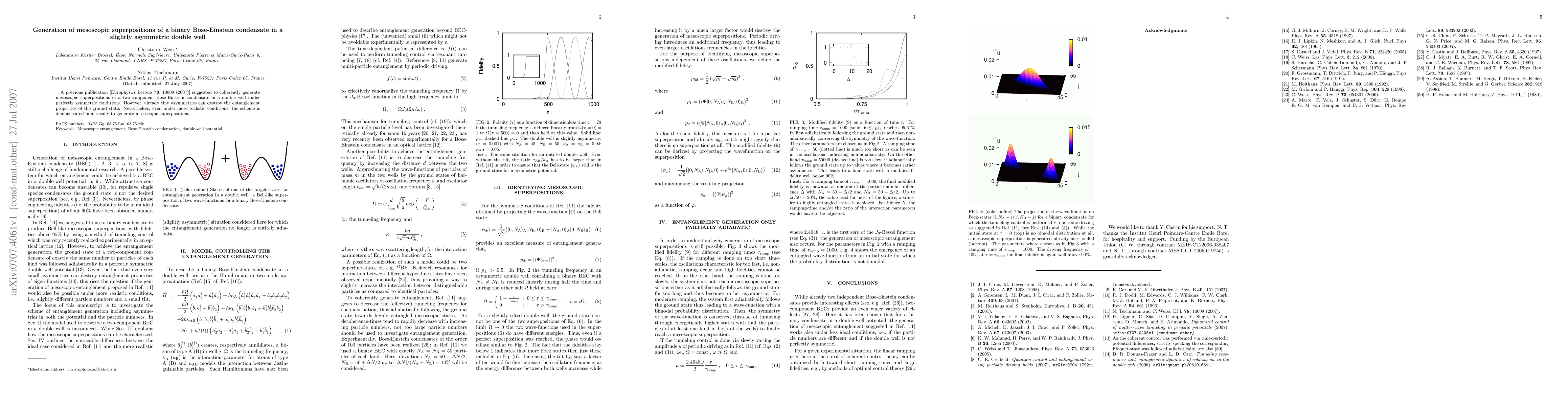 A previous publication [Europhysics Letters 78, 10009 (2007)] suggested to coherently generate mesoscopic superpositions of a two-component Bose-Einstein condensate in a double well under perfectly symmetric conditions. However, already tiny asymmetries can destroy the entanglement properties of the ground state. Nevertheless, even under more realistic conditions, the scheme is demonstrated numerically to generate mesoscopic superpositions.
