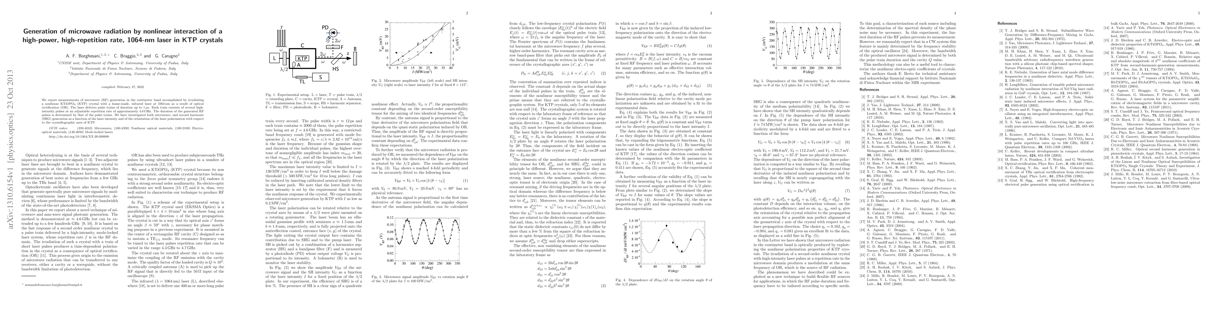 We report measurements of microwave (RF) generation in the centimeter band accomplished by irradiating a nonlinear KTiOPO$_4$ (KTP) crystal with a home-made, infrared laser at $1064\,$nm as a result of optical rectification (OR). The laser delivers pulse trains of duration up to $1\,\mu$s. Each train consists of several high-intensity pulses at an adjustable repetition rate of approximately $ 4.6\,$GHz. The duration of the generated RF pulses is determined by that of the pulse trains. We have investigated both microwave- and second harmonic (SHG) generation as a function of the laser intensity and of the orientation of the laser polarization with respect to the crystallographic axes of KTP.