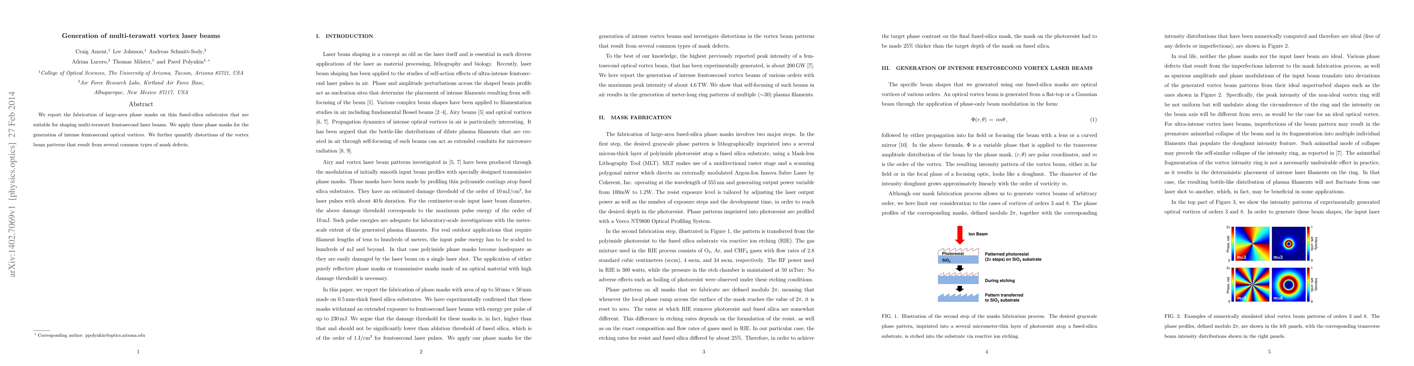 We report the fabrication of large-area phase masks on thin fused-silica substrates that are suitable for shaping multi-terawatt femtosecond laser beams. We apply these phase masks for the generation of intense femtosecond optical vortices. We further quantify distortions of the vortex beam patterns that result from several common types of mask defects.