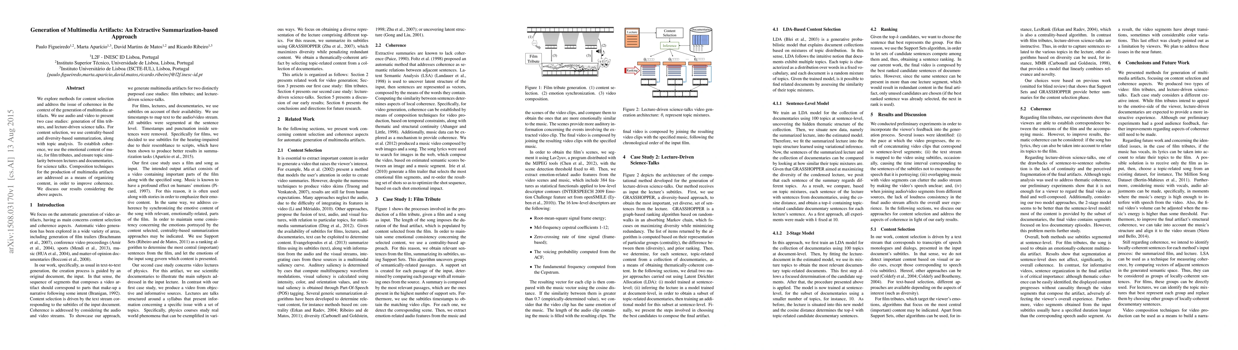This paper investigates extractive summarization techniques for generating coherent multimedia artifacts, such as film tributes and science talks, using centrality-based and diversity-based summarization, topic analysis, and composition methods to enhance content organization and coherence. Results demonstrate effective content selection and coherence establishment through emotional and topic-based strategies.
