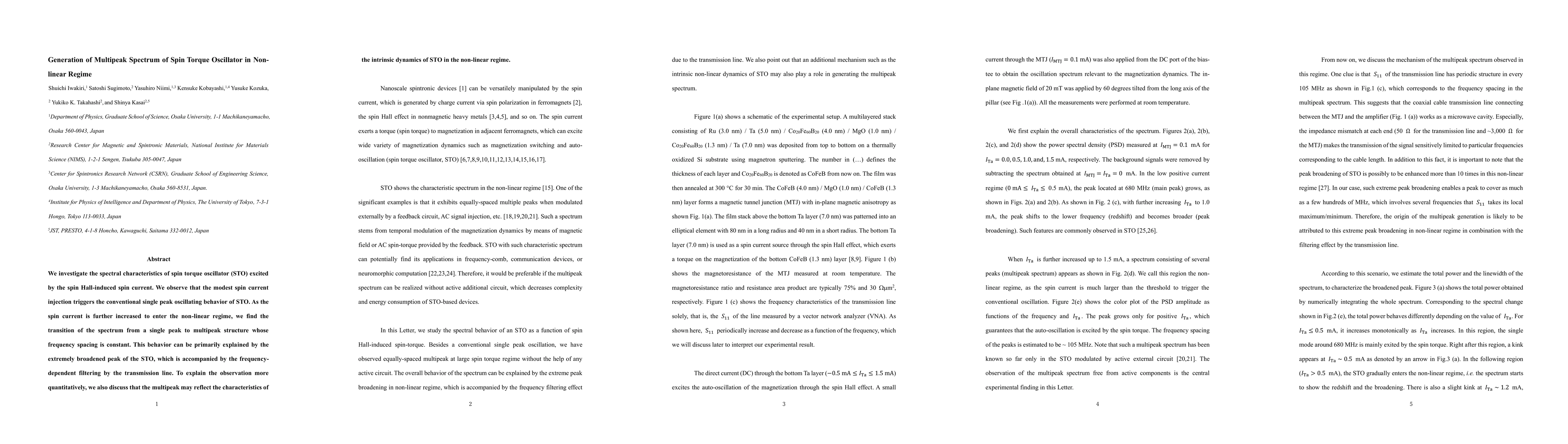We investigate the spectral characteristics of spin torque oscillator (STO) excited by the spin Hall-induced spin current. We observe that the modest spin current injection triggers the conventional single peak oscillating behavior of STO. As the spin current is further increased to enter the non-linear regime, we find the transition of the spectrum from a single peak to multipeak structure whose frequency spacing is constant. This behavior can be primarily explained by the extremely broadened peak of the STO, which is accompanied by the frequency-dependent filtering by the transmission line. To explain the observation more quantitatively, we also discuss that the multipeak may reflect the characteristics of the intrinsic dynamics of STO in the non-linear regime.