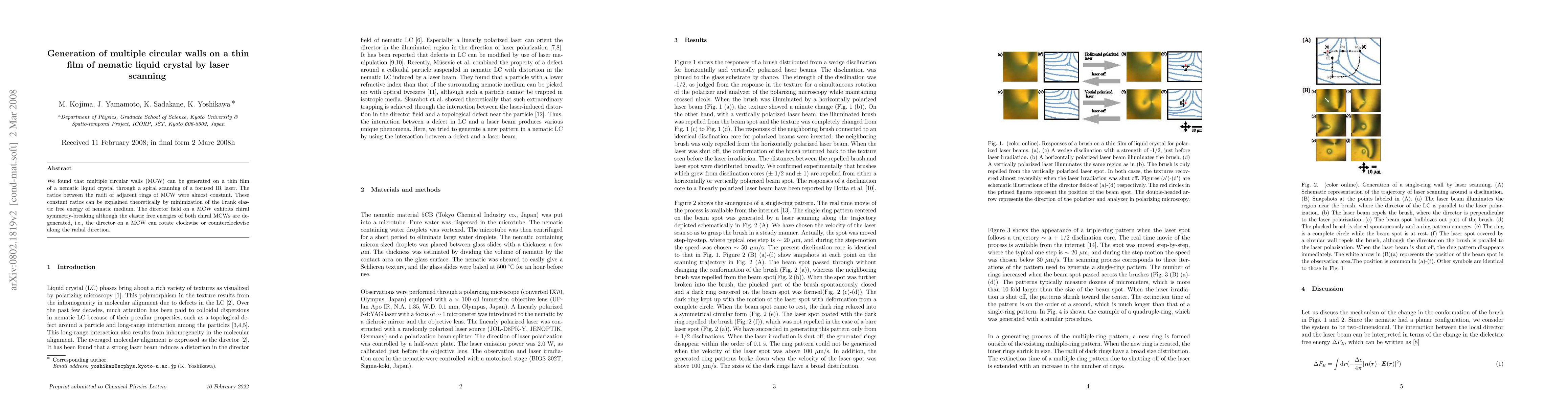 Summary: Researchers generated multiple circular walls on a nematic liquid crystal film via spiral laser scanning, finding consistent radial ratios explained by Frank elastic energy minimization. The chiral symmetry-breaking in the director field, despite degenerate elastic energies, was observed.