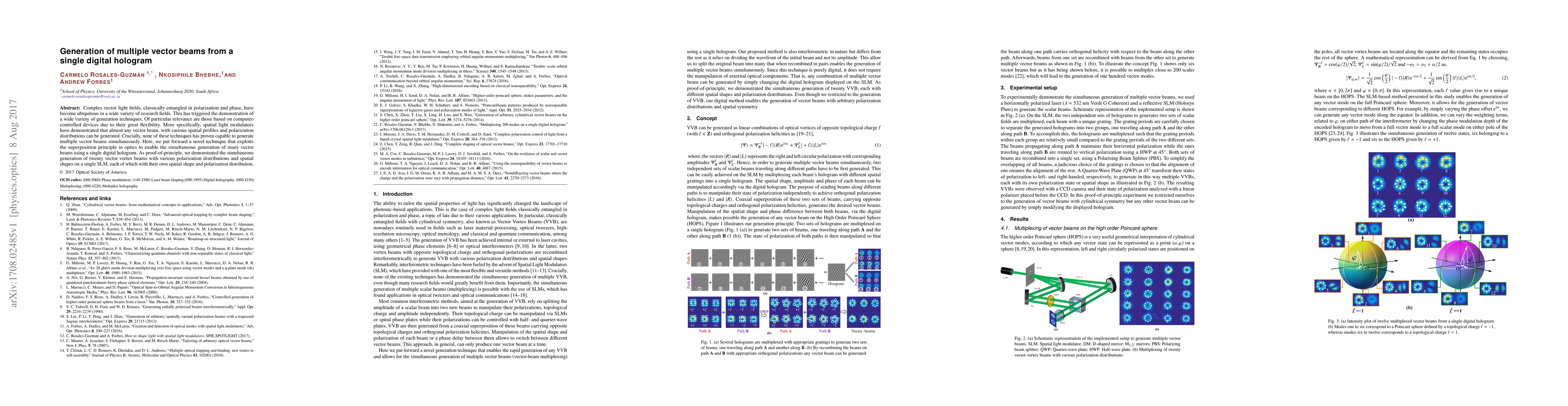 This paper introduces a novel technique using a single digital hologram to generate multiple vector beams simultaneously, leveraging the superposition principle in optics. The method demonstrates the capability to produce twenty distinct vector vortex beams with varied polarizations and spatial profiles on a single spatial light modulator.